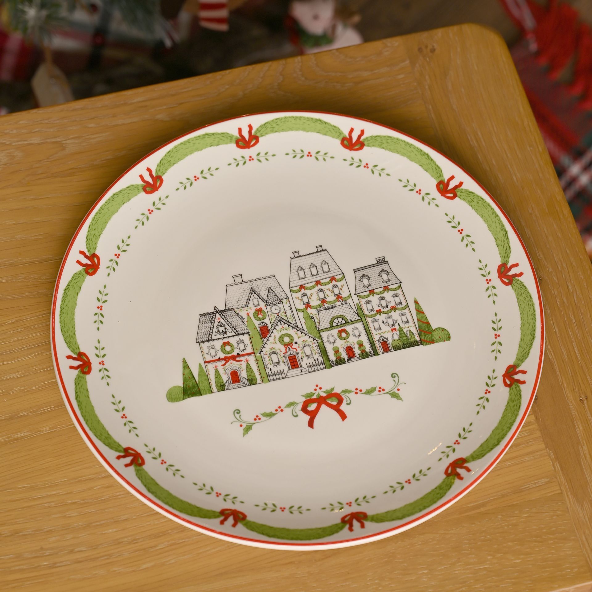 Bring a vintage-inspired festive touch to the table with this porcelain dinner plate featuring a charming Christmas house design.