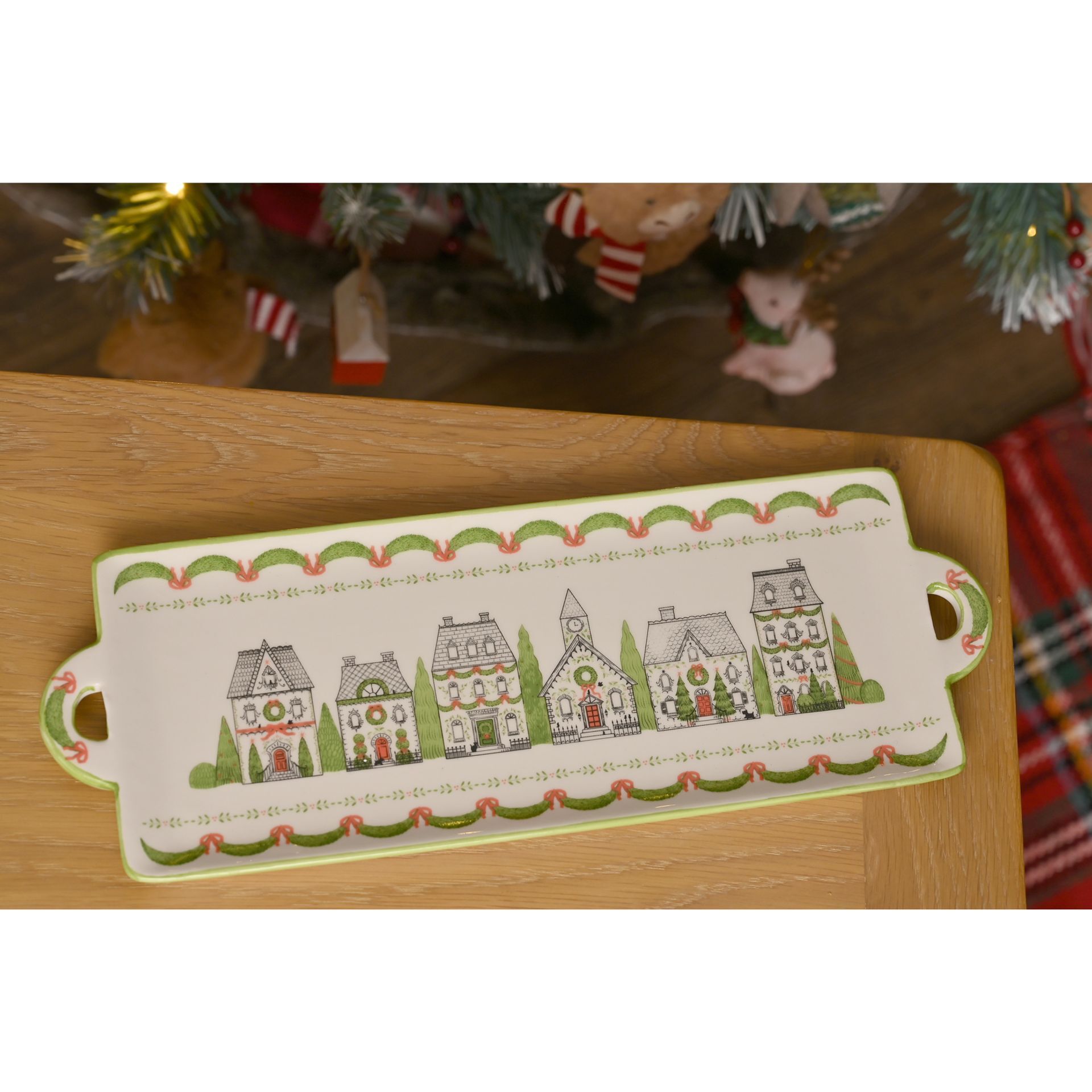 Add a festive focal point to seasonal serveware with the Rectangular Cake Plate featuring a vintage-inspired illustration of colourful Christmas houses.