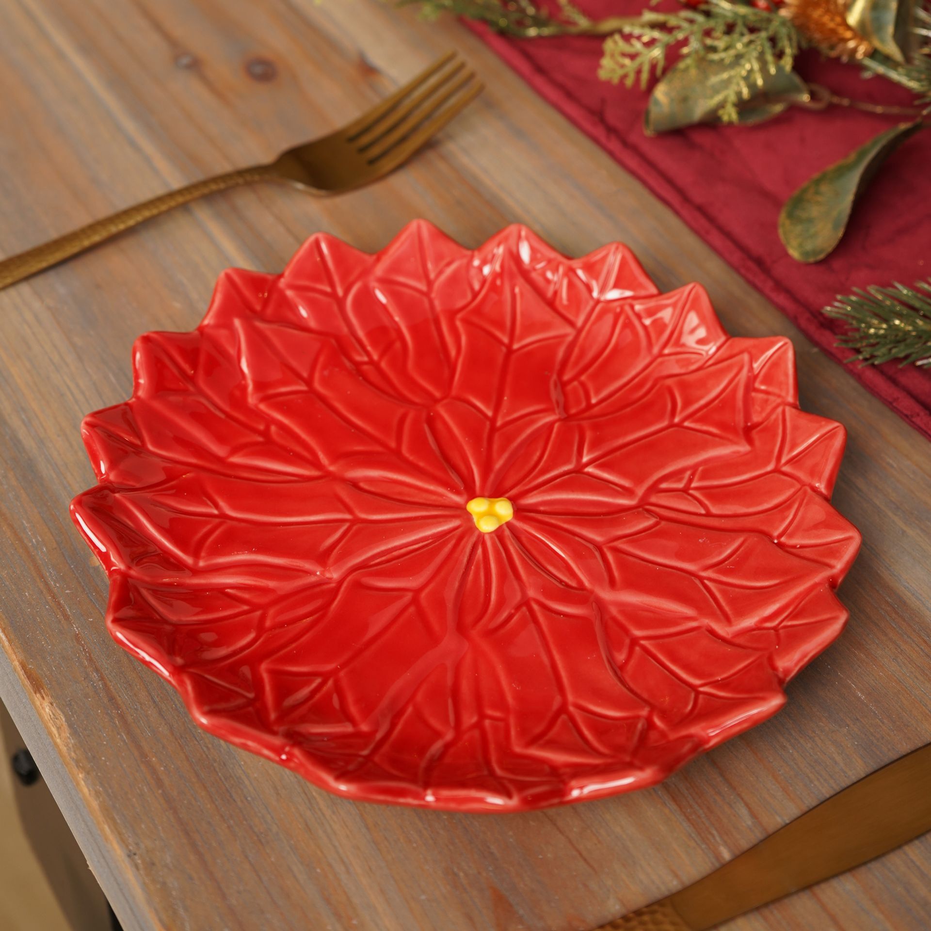 The Red Ceramic Poinsettia Plate brings festive charm to seasonal dining, making it a perfect addition to seasonal gatherings. This vibrant red ceramic dish, shaped like a lotus flower, features intricate petals and a central yellow detail, adding a refined touch to the Christmas table. The smooth glaze and sculpted form create a striking yet classic accent. Complete the look with refined designs from the Regal Tidings collection, enhancing your festive decor with elegance.