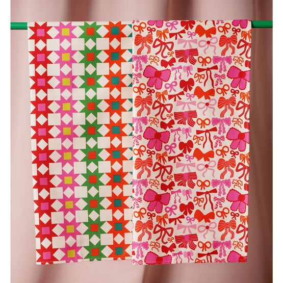 The set showcases bold geometric shapes and bow patterns in red, pink, and green, creating a lively design that blends function with seasonal flair. Ideal for drying dishes or adding a decorative touch to the kitchen, these towels make a practical yet joyful gift.