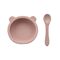 The matt pink silicone is safe, durable, stylish and easy to clean. It features a bib, character bowl and spoon, all designed with tiny hands in mind.