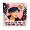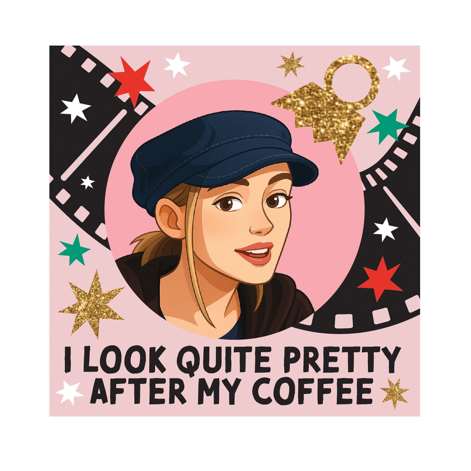 The image features a colourful and whimsical design with a smiling woman wearing a beret, surrounded by stars, film reels, and the text "I look quite pretty after my coffee." Presented in a window box, it makes a charming gift or accent for festive gatherings.