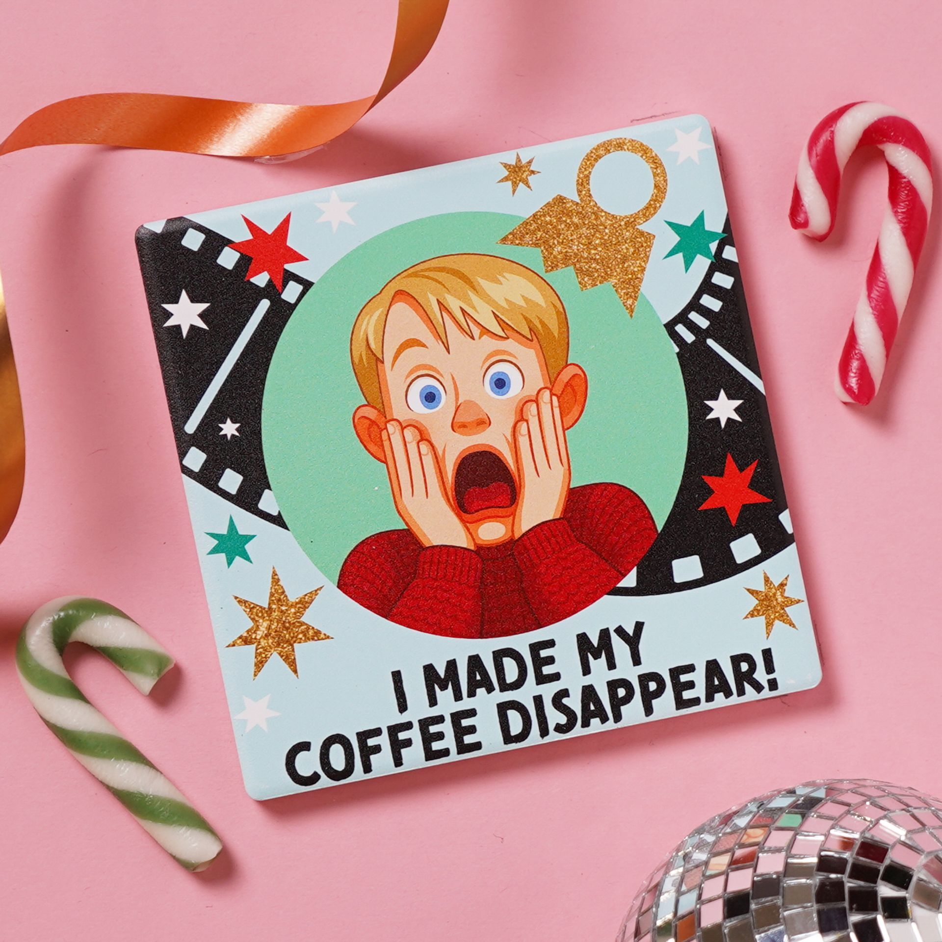 The image depicts a cartoon-style illustration of a young boy with a surprised expression, surrounded by stars and film reel imagery, with the text "I MADE MY COFFEE DISAPPEAR!" written below. Presented in a window box, this ceramic coaster adds a touch of humour and charm.