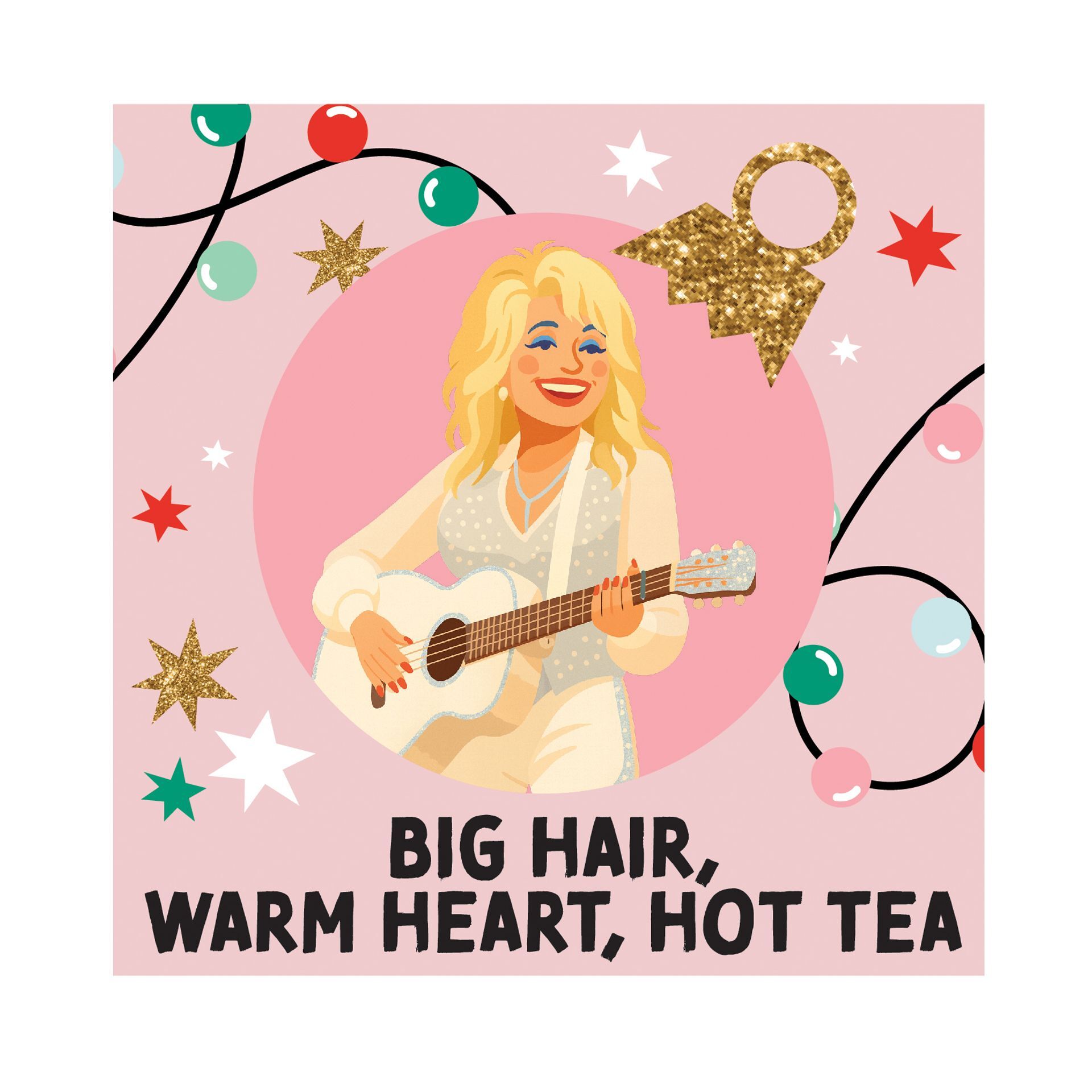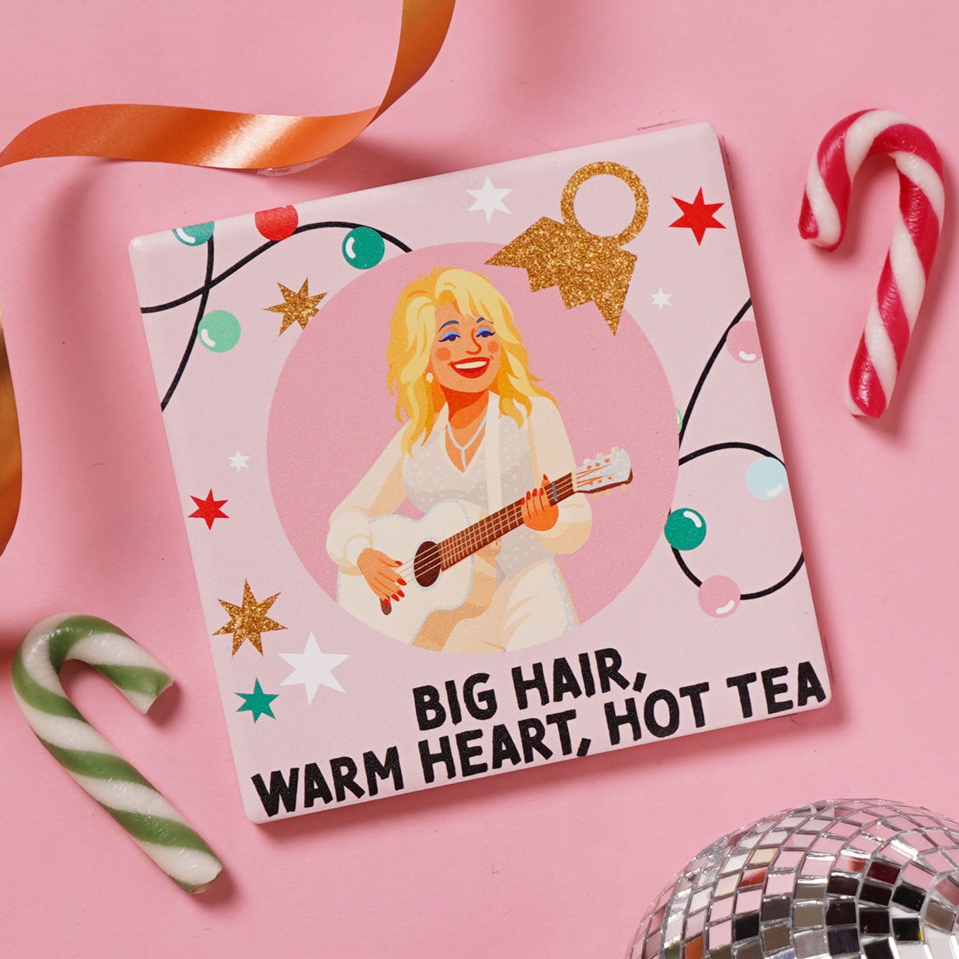 A pink ceramic coaster features a greeting card-inspired design, showing a smiling, blonde-haired woman playing guitar, surrounded by stars . The phrase "Big Hair, Warm Heart, Hot Tea" adds a cheerful, nostalgic touch to the piece.