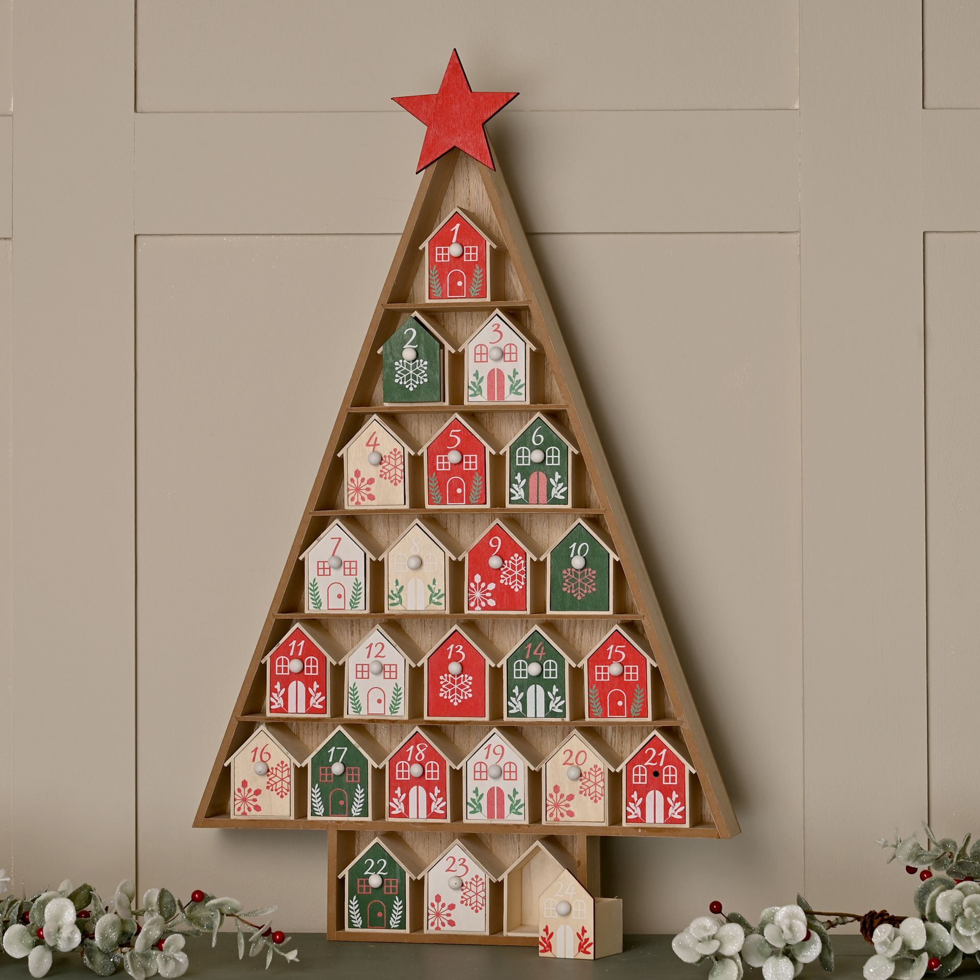 Large Christmas Advent Calendar in Tree Shape with Cottages- 62cm Tall