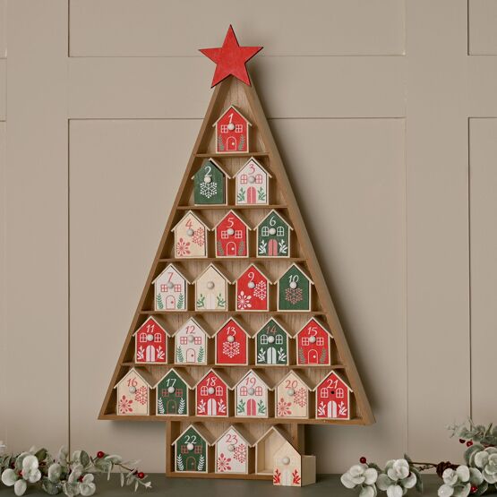 The Large Christmas Advent Calendar in Tree Shape with Cottages blends tradition and rustic charm, creating a festive focal point.