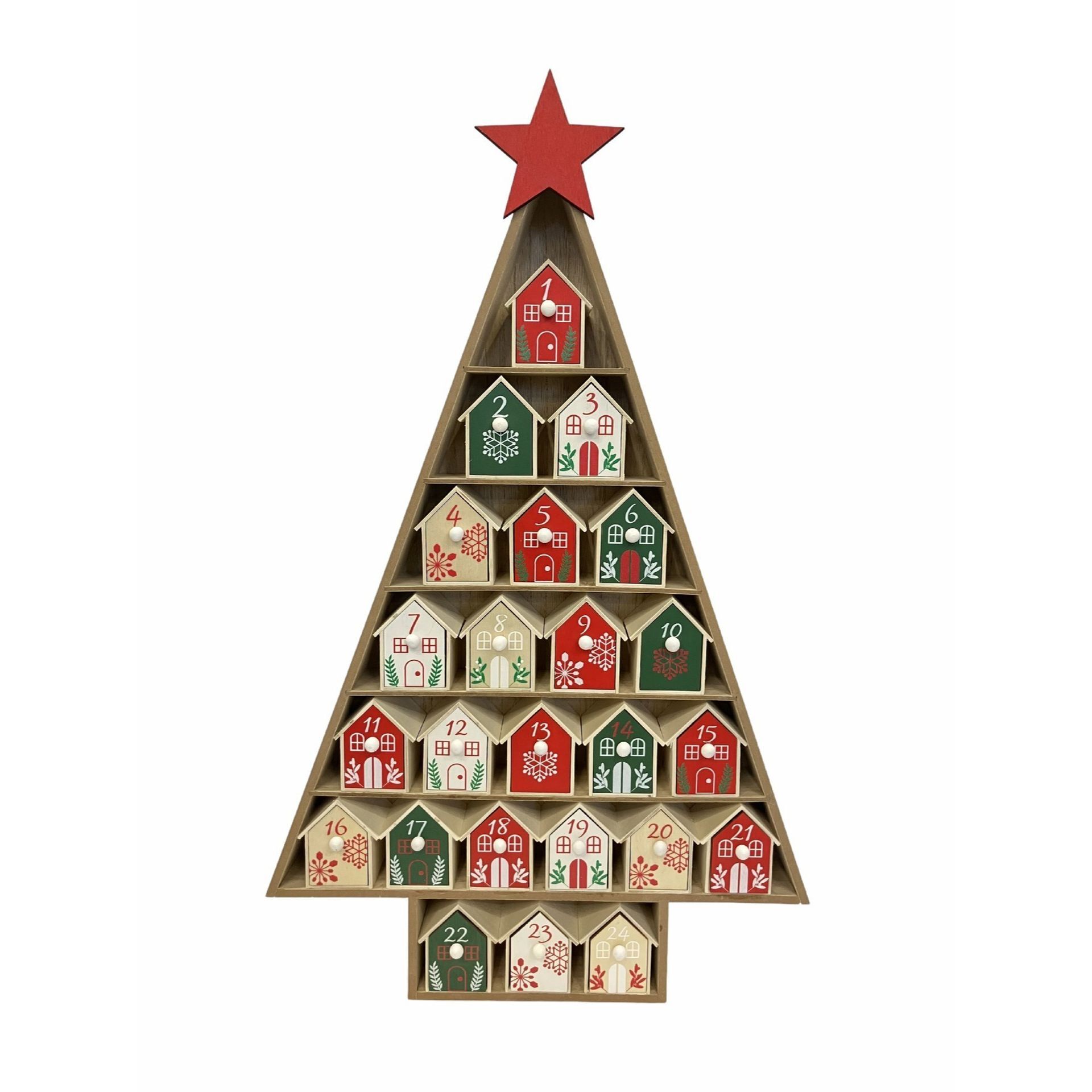 A wooden tree silhouette features rows of colourful cottages painted in seasonal red, green, and wood tones, topped with a bold red star. Its handcrafted-inspired finish evokes nostalgia, while numbered doors invite daily festive anticipation. At 62cm tall, it's sure to make an impact in shop windows, on mantelpieces and in seasonal displays.