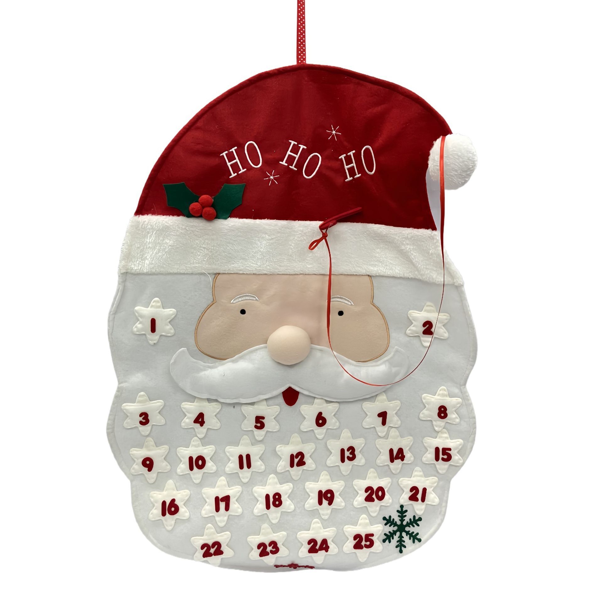 A red Santa Claus-themed advent calendar, with 25 numbered pockets for daily surprises and the cheerful text "HO HO HO" displayed prominently across the design. The soft fabric finish adds a cosy, tactile element to seasonal decor.