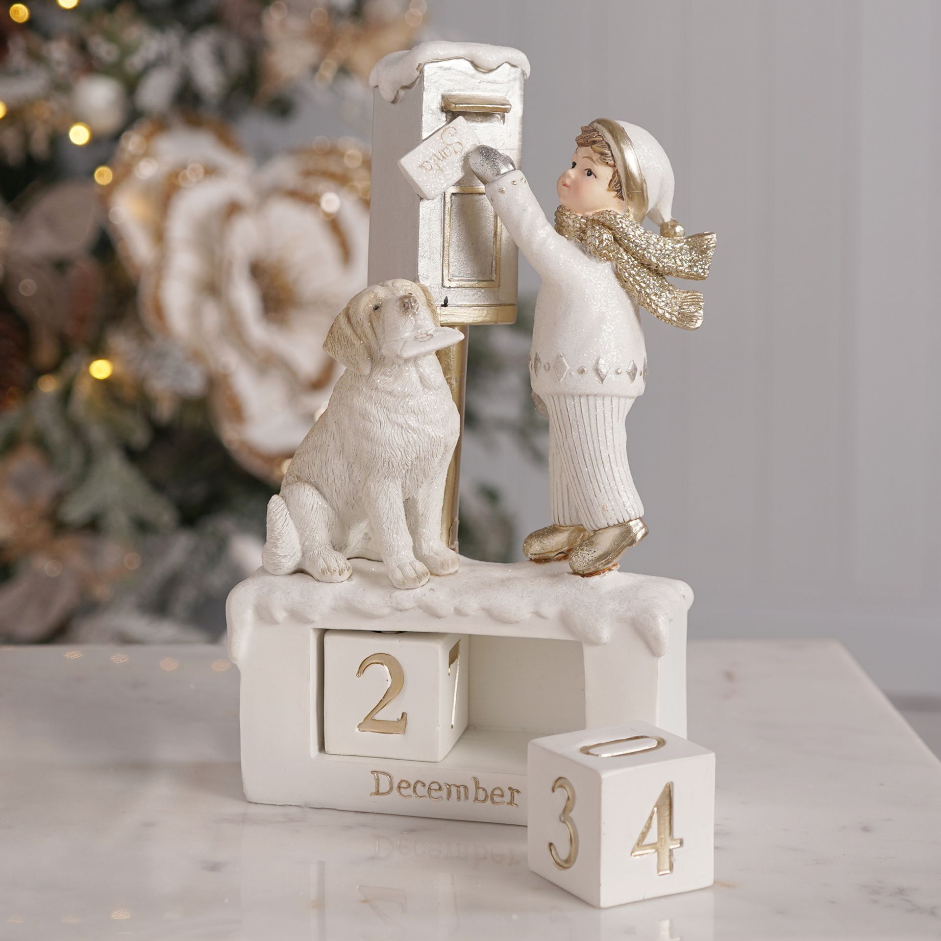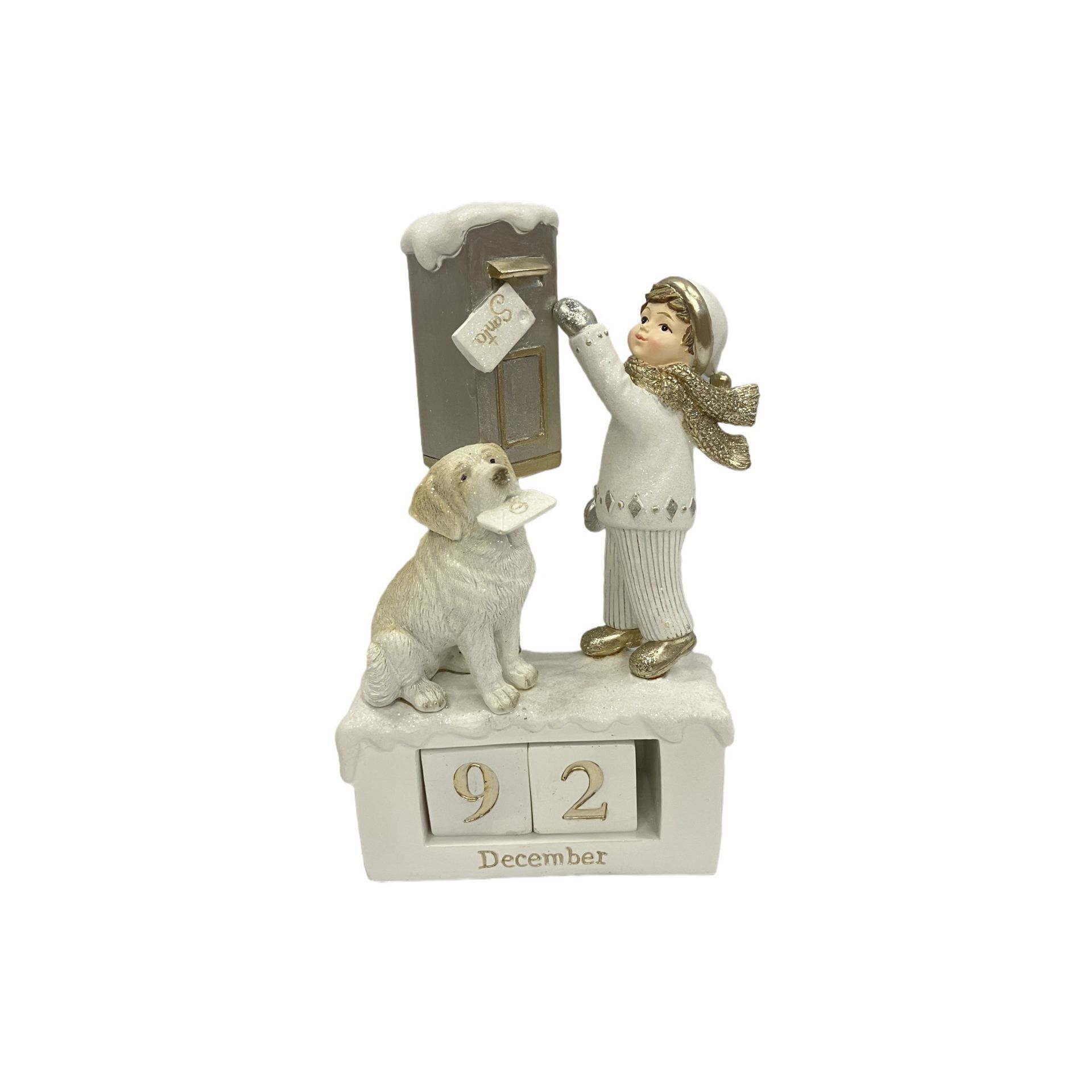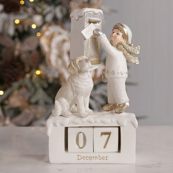 A young child in a winter outfit stands next to a white dog on a wooden calendar block. Finished in crisp white and gold tones, the scene evokes a gentle sense of anticipation and tradition.