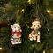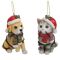 Two adorable Christmas-themed animal ornaments, one a yellow dog and the other a grey cat, both wear Santa hats and scarves and dressed in festive lights.