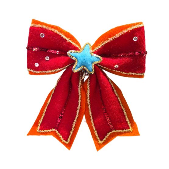 A vibrant, red and orange felt bow with a blue star decoration creates a cheerful centrepiece, blending bold colour with soft texture for a lively seasonal statement. The design captures the joyful spirit of the Whimsical collection.