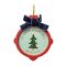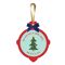 A red and green Christmas ornament with a navy blue bow, it features a Christmas tree motif and the phrase "May your days be merry and bright and full of love".