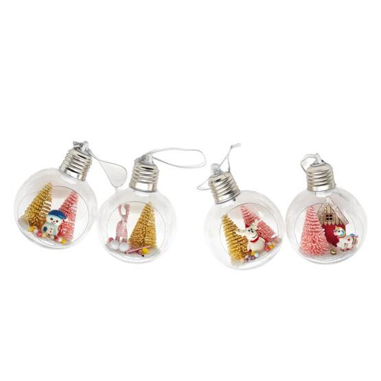 Set of 4 LED Light Up Tree Baubles with Pink Christmas Scenes - 8cm