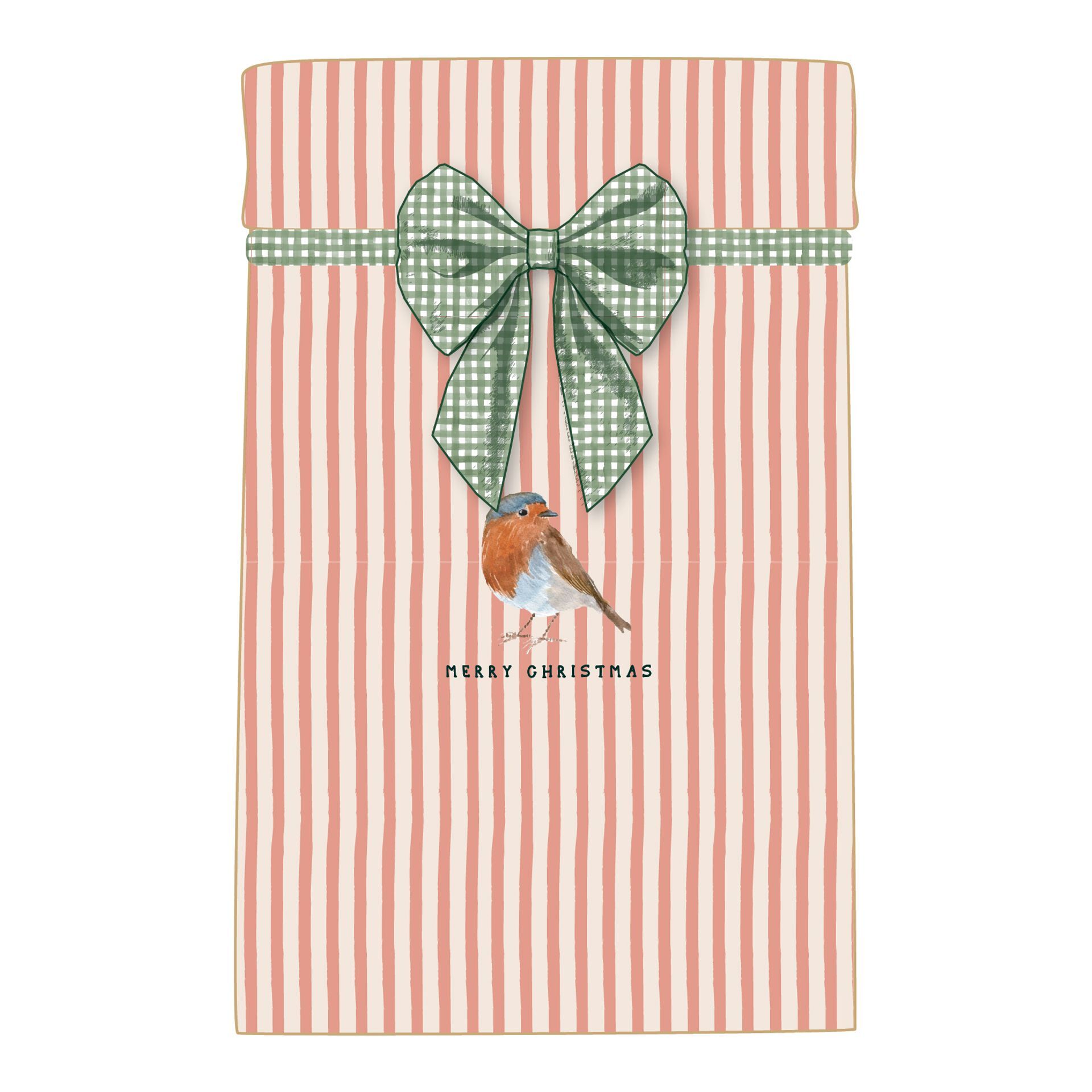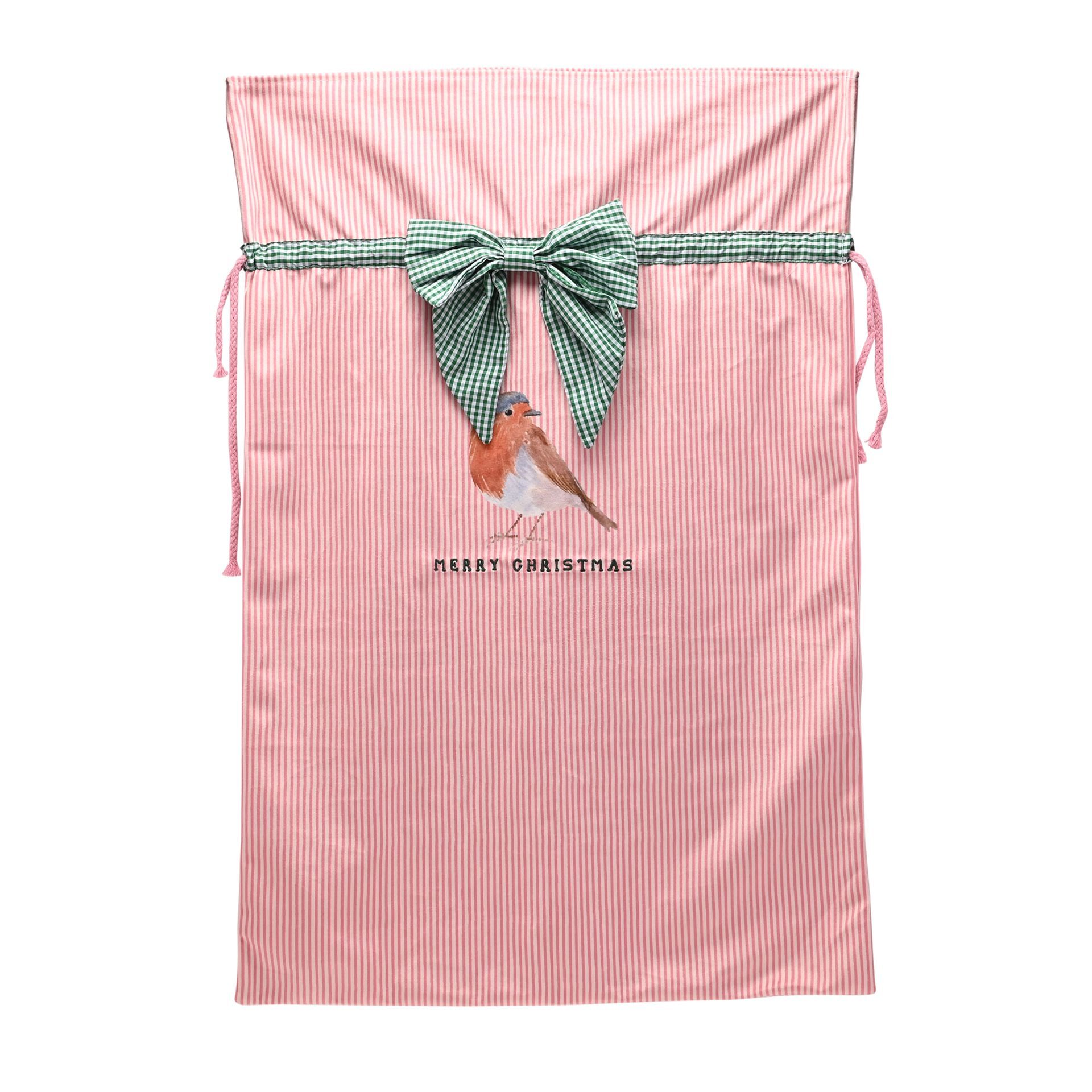 210gsm Velvet Sack with Bow, Candy Stripe Printing and Front with Robin Embroidery 70x48cm