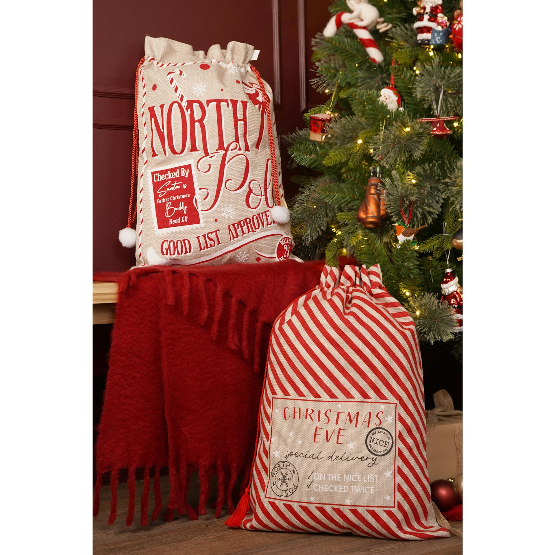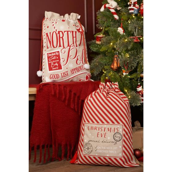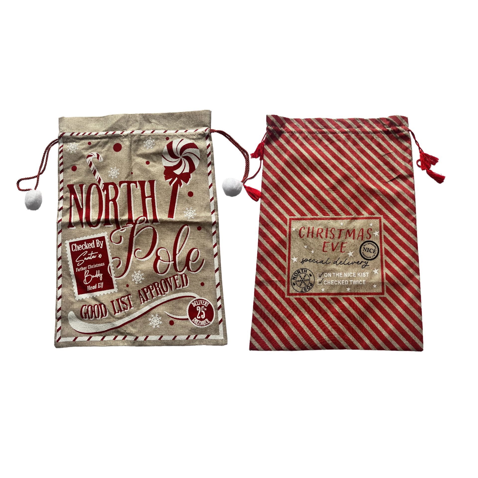 Two festive-themed gift bags with festive designs and text, one labelled "North Pole" and the other "Christmas Eve", crafted from natural jute for a rustic yet modern feel. Each sack features bold, cheerful graphics and sturdy drawstring closures, perfect for presenting Christmas surprises.