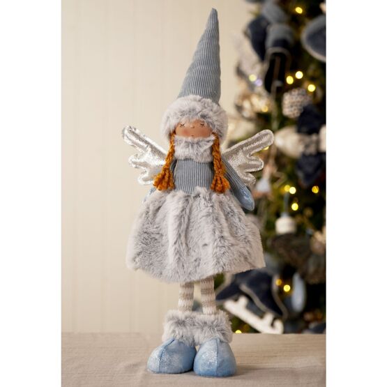 The Blue Fabric Standing Angel – 44cm presents a graceful upright figure with wings, textured body, and pointed hat in tonal blues.