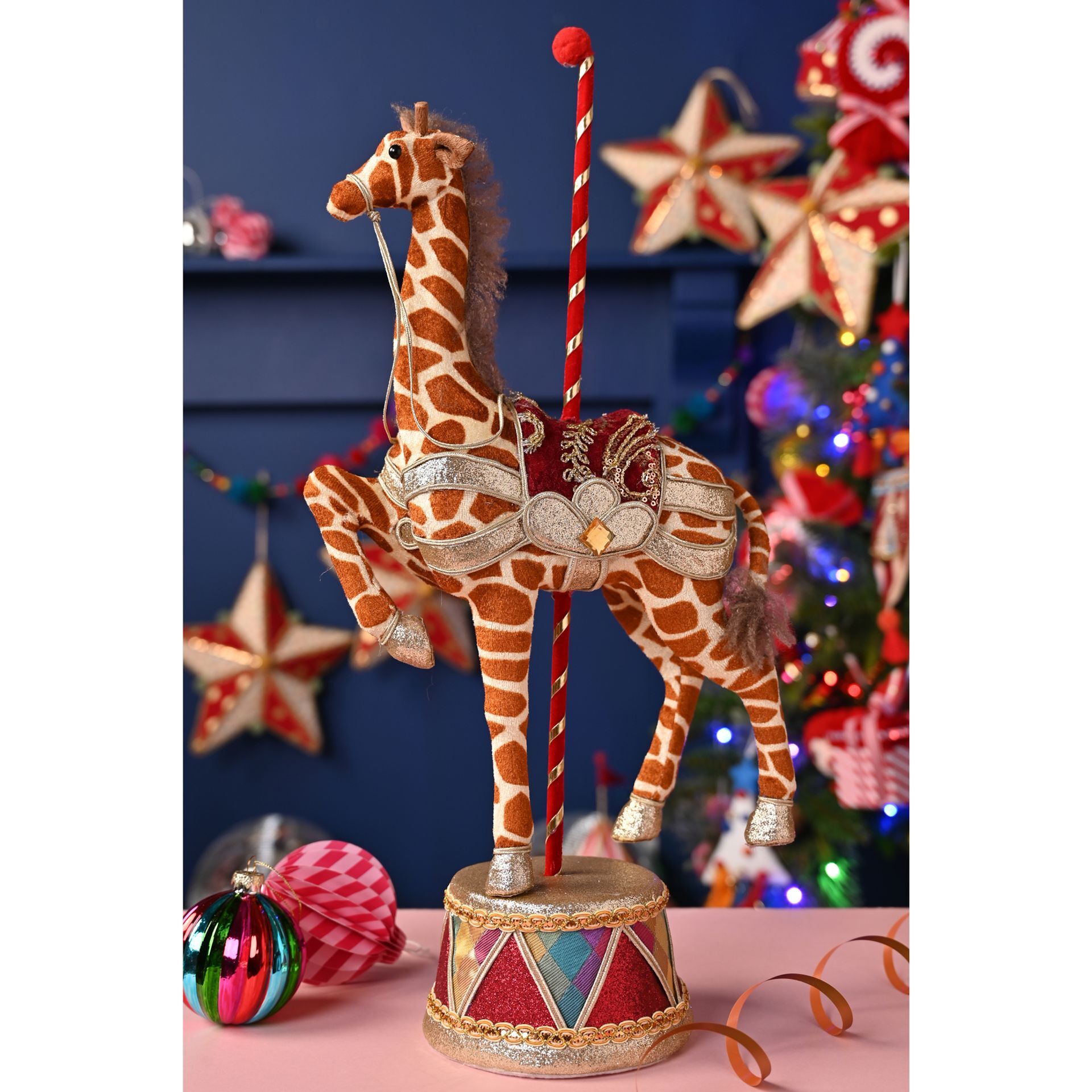 Plush and fabric-covered, in the style of a carousel horse, with a red and white striped pole, poised on a drum-style base. Full of personality and circus sparkle, it mixes kitsch flair and colour-pop fun.