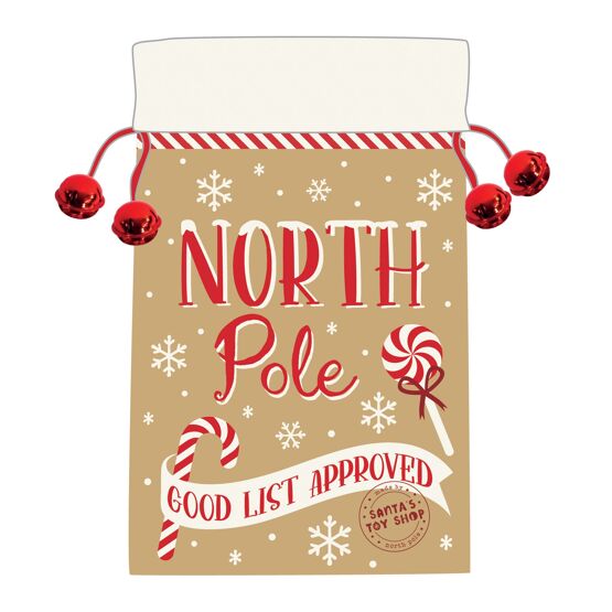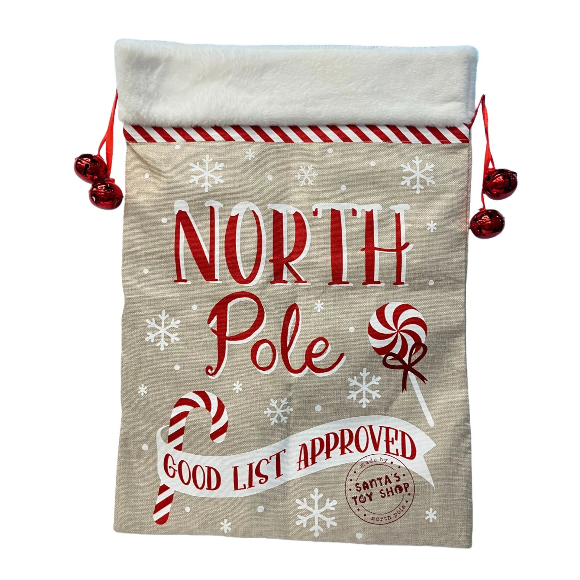 Featuring a wooden sign motif with bold red "North Pole" lettering, snowflakes, and candy canes, this jute sack is accented by four bells and a soft fur trim.