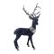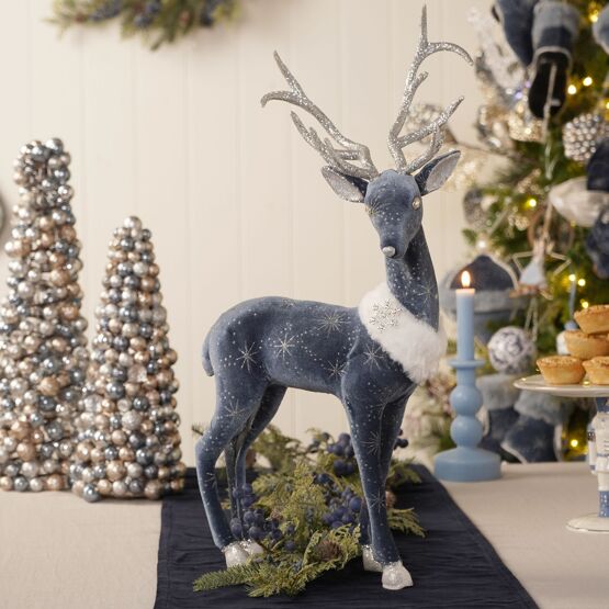 The Deer Ornament – 57cm stands tall in deep blue with white antlers, a faux fur scarf, and snowflake patterning.