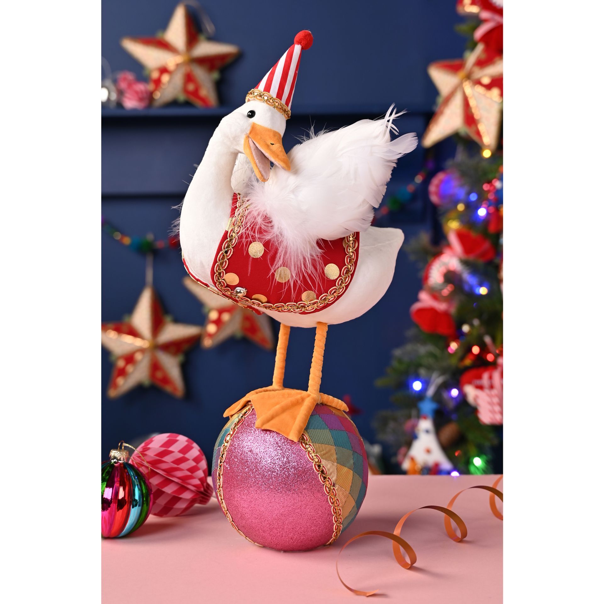 The Fabric Covered Duck on a Ball White 33cm x 26cm x 52cm is a whimsical statement ornament from the Whimsical Wonderland range.