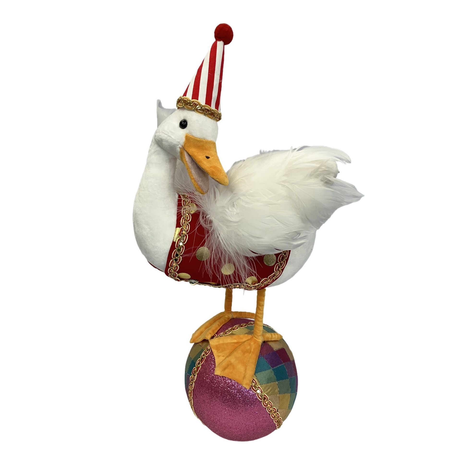A white feathered duck wearing a red and white striped hat perches on a colourful, patterned ball, channelling showtime energy. Crisp white contrasts lively stripes and clashing patterns, with charming details that nod to retro circus style.