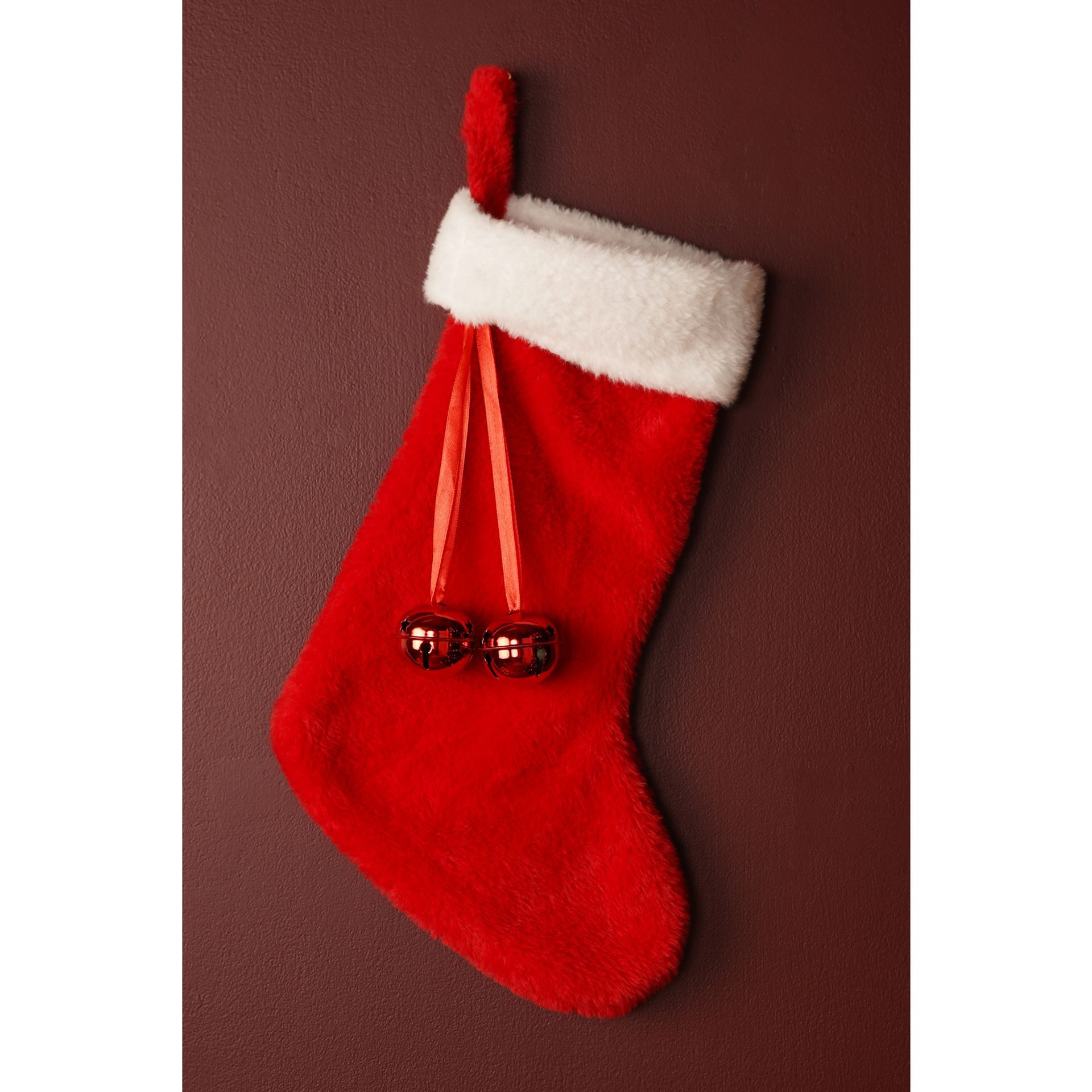 A vibrant red stocking is finished with a plush white fur trim and two jingle bells, creating a cheerful accent with a hint of nostalgia. The bold colour and tactile details bring a fresh, modern edge to seasonal decor.