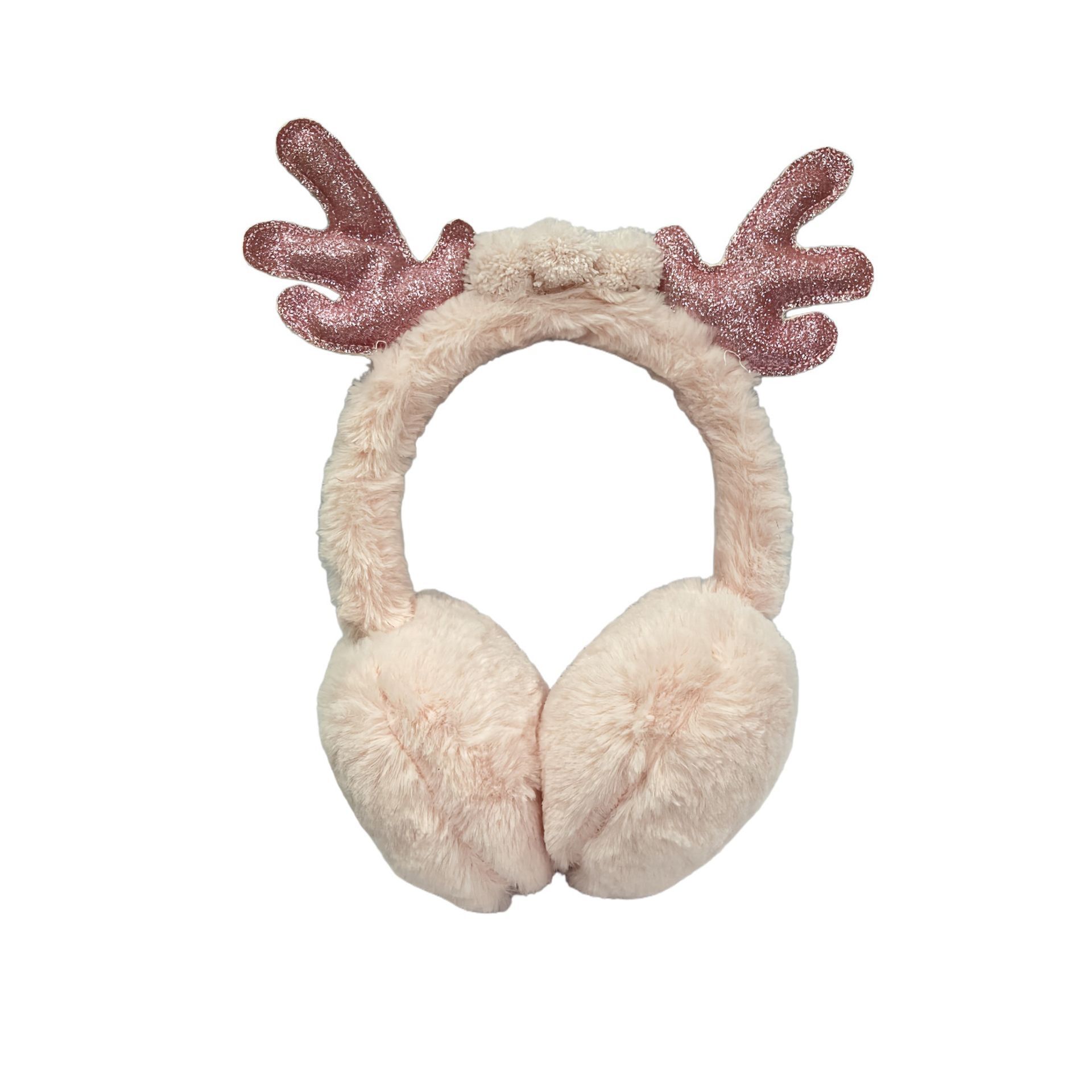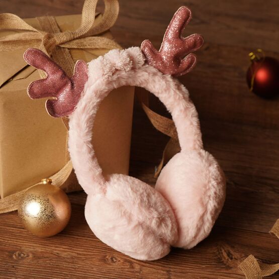 A pair of fluffy, pink-coloured earmuffs is accented by glittery pink antlers, blending soft textures with a touch of sparkle for a cheerful, modern look. The whimsical reindeer motif adds a dash of humour and seasonal charm.