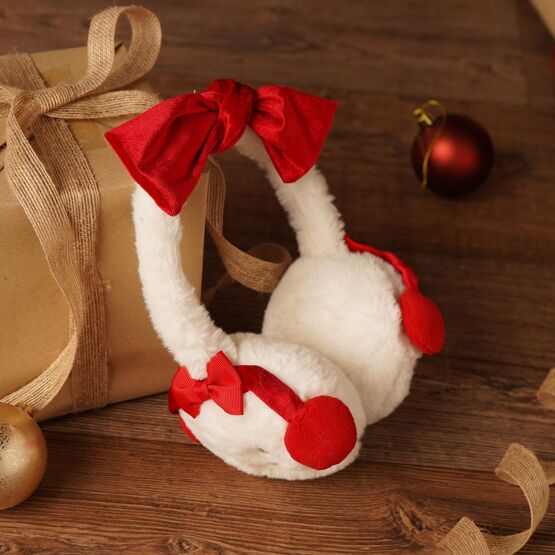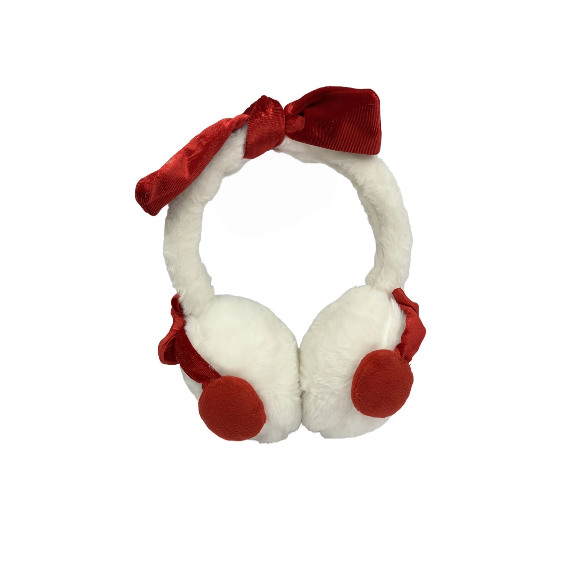 A pair of white and red earmuffs with a cheerful snowman motif wearing earmuffs with a bright red bow on top, these ear muffs capture the spirit of winter fun with a modern edge. The soft textures and bold colours add a touch of whimsy to seasonal decor.