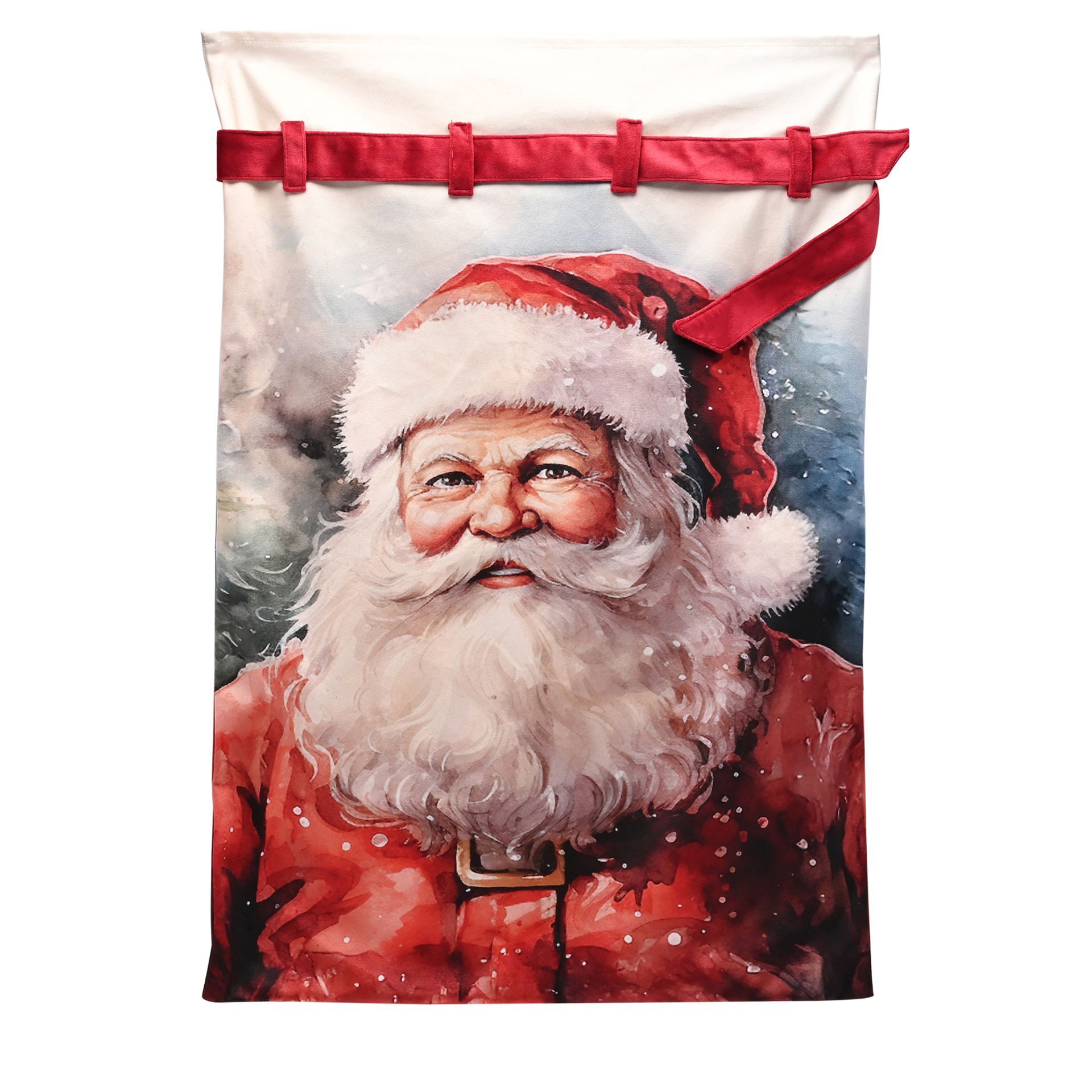 The 210gsm Santa Print Sack and Back Checkered Pattern, Red Fringe and Bow 70x48cm brings festive charm to seasonal gift-giving. A jolly Santa Claus in a red suit with a white beard is printed on sturdy 210gsm fabric, complemented by a classic checkered back, playful red fringe, and a decorative bow. The generous size is ideal for holding Christmas surprises. Complete the look with more refined designs from the Regal Tidings collection.