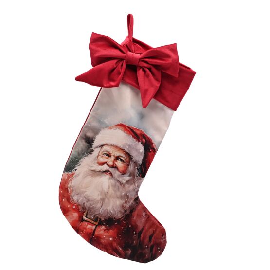 The 210gsm Santa Print Stocking and Back Checkered Pattern, Red Fringe and Bow is a festive Christmas stocking designed to capture the spirit of the season. A large red bow sits atop a cheerful Santa Claus in his classic red suit, complemented by a bold checkered pattern and finished with a playful red fringe. The 210gsm fabric offers a soft, substantial feel, perfect for seasonal displays. Complete the look with more refined designs from the Regal Tidings collection.