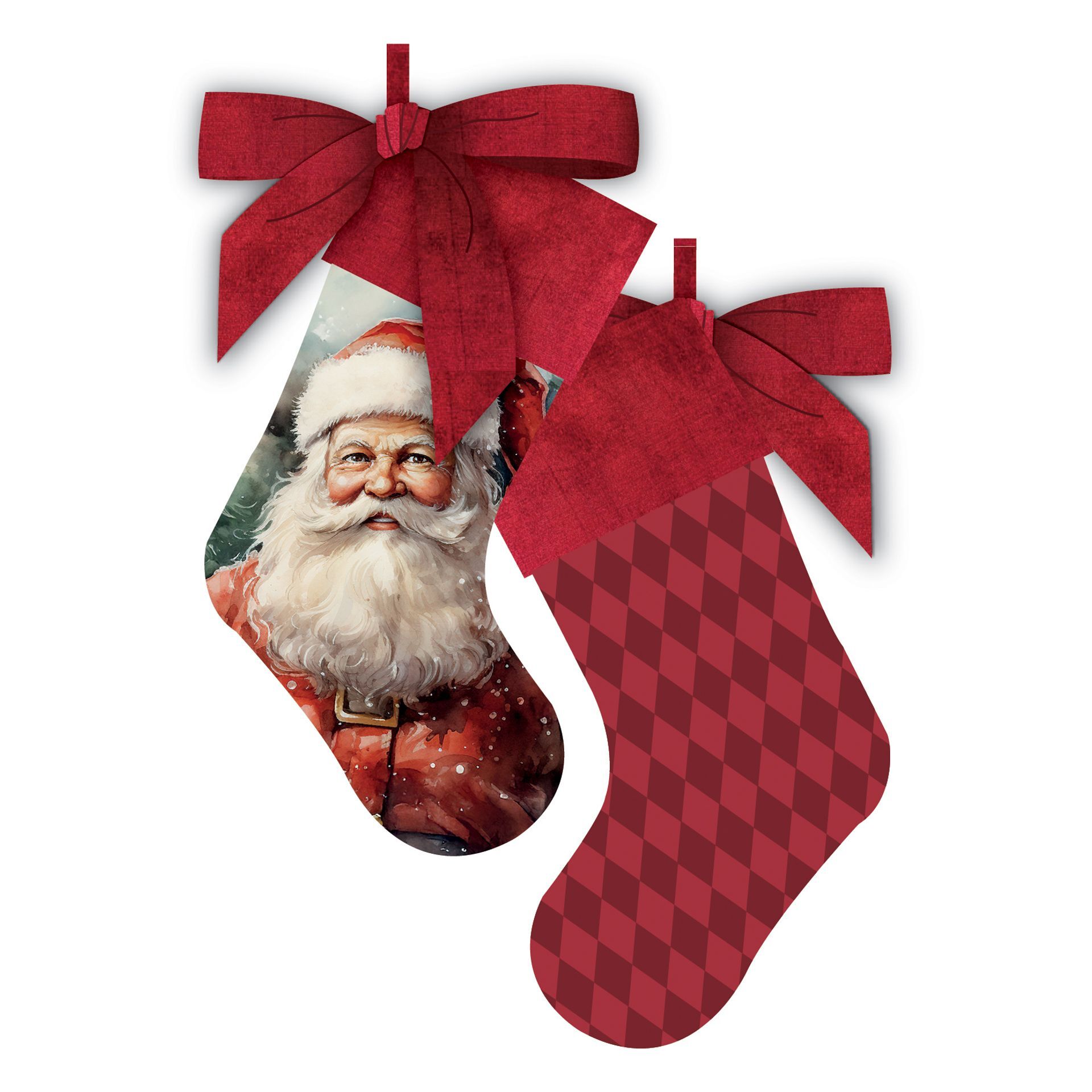 Santa Print Stocking and Back Checkered Pattern, Red Fringe and Bow