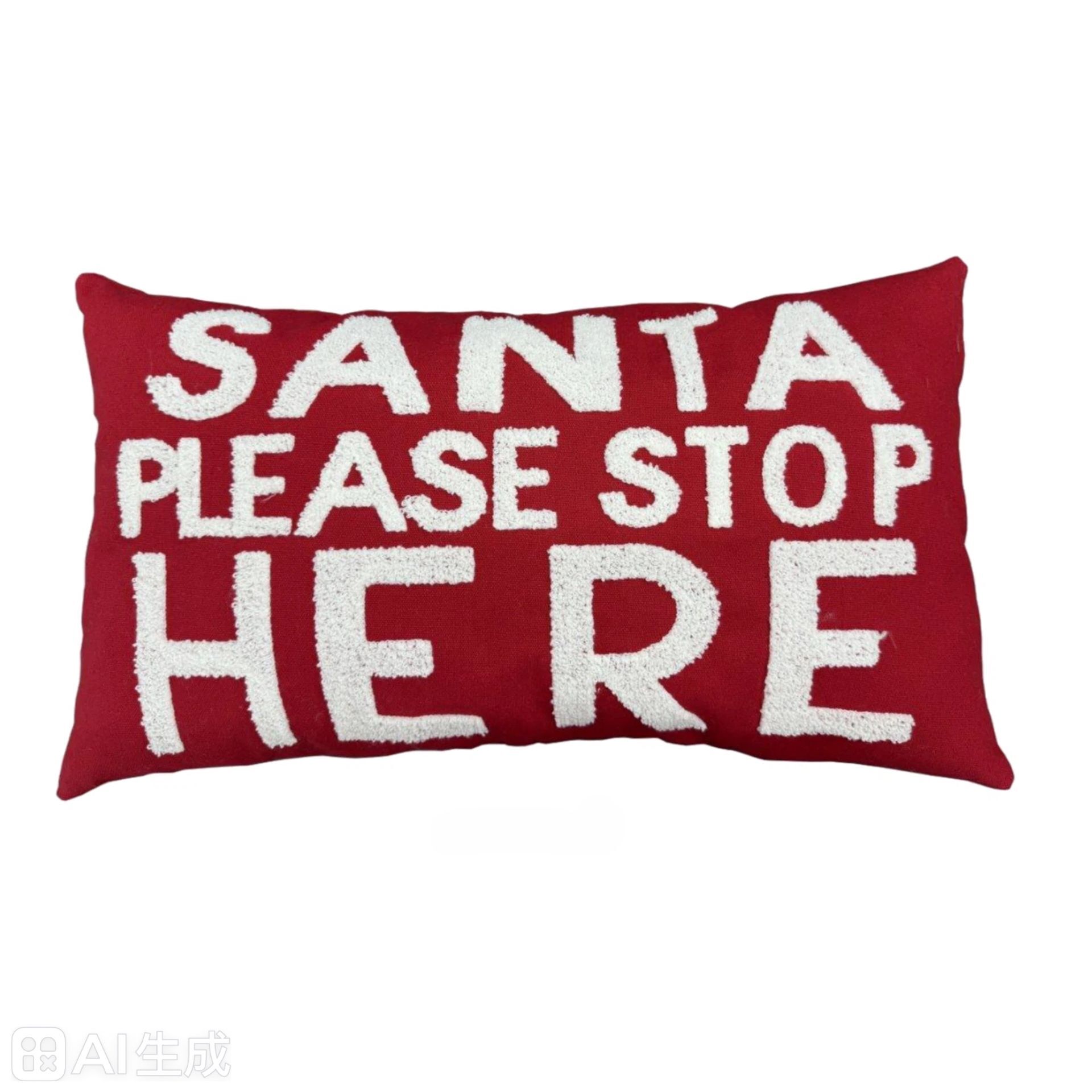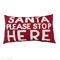 A red rectangular pillow with the text "SANTA PLEASE STOP HERE" written in white letters, it features tufted fabric for added texture and a playful touch.