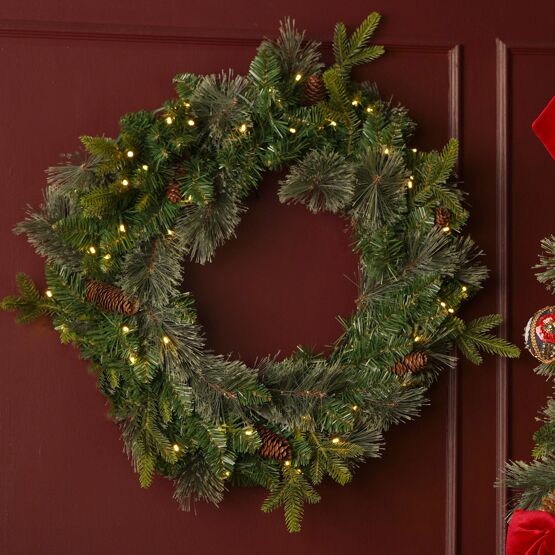 A lush, evergreen wreath adorned with pinecones and illuminated by twinkling lights, it offers a refined take on traditional Christmas decor. The integrated timer function ensures effortless ambience throughout the season.