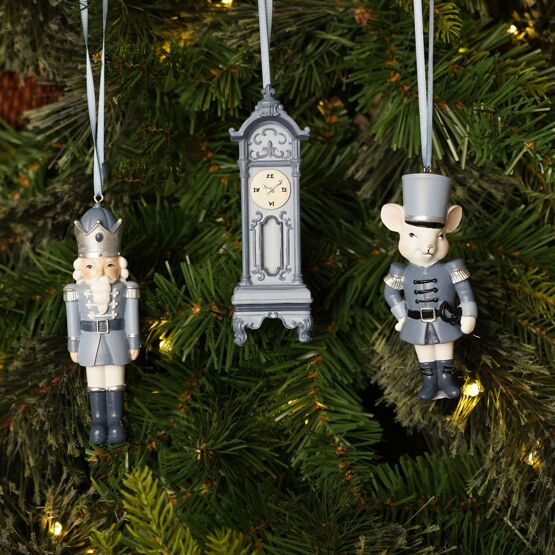 The Resin Hanging Ornaments – Nutcracker, Clock, and Mouse bring timeless storytelling charm to tree décor.