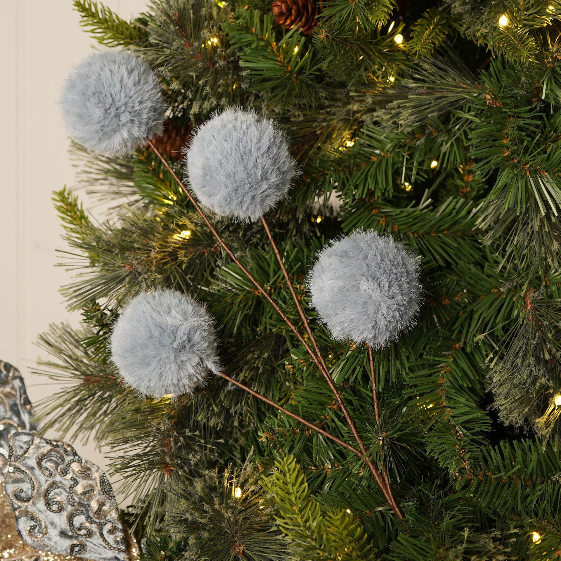 The Blue Velour Stem Pick with 4 Pom Poms adds soft texture and a playful finish to festive styling.