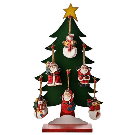 THE SEASONAL GIFT CO.'s Christmas Tree CDU, complete with 36 Assorted Character Decorations—a charming ensemble that brings the joy of the season to life. Its classic green colour adds a touch of tradition, while the wooden construction exudes warmth and rustic charm. Featuring three different Santa designs and three different snowman designs, this Christmas Tree will light up anywhere it is placed. Ideal for stores that want to embrace the festive season. Hang tag packaging.