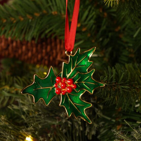 This festive green and red ornament, shaped like a holly leaf with bright red berries, is suspended by a vibrant red ribbon. Its bold colours and crisp silhouette offer a fresh, modern take on traditional holiday motifs.