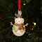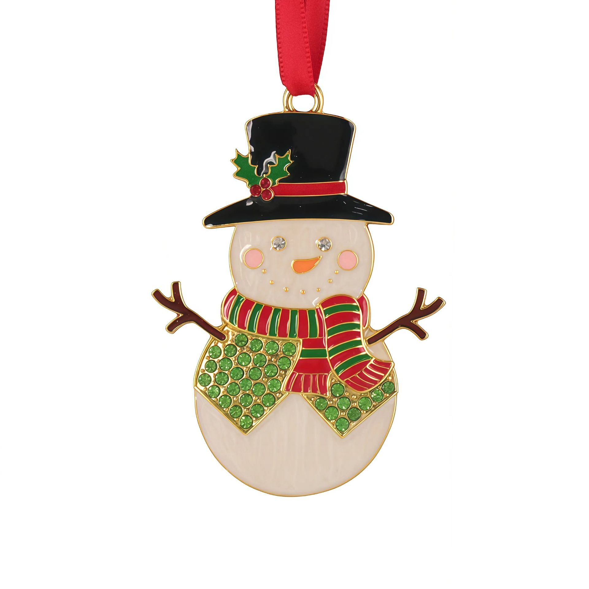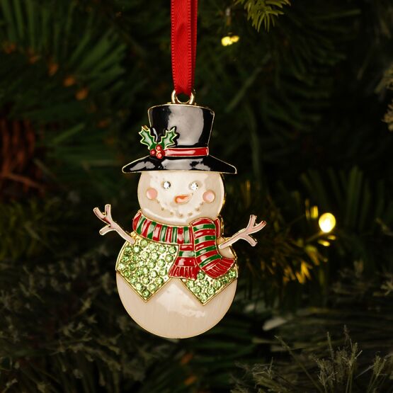 A cheerful snowman ornament with a black top hat and red scarf hanging on a vibrant red ribbon. The design captures festive nostalgia with a fresh, modern edge, perfect for adding character to any tree.