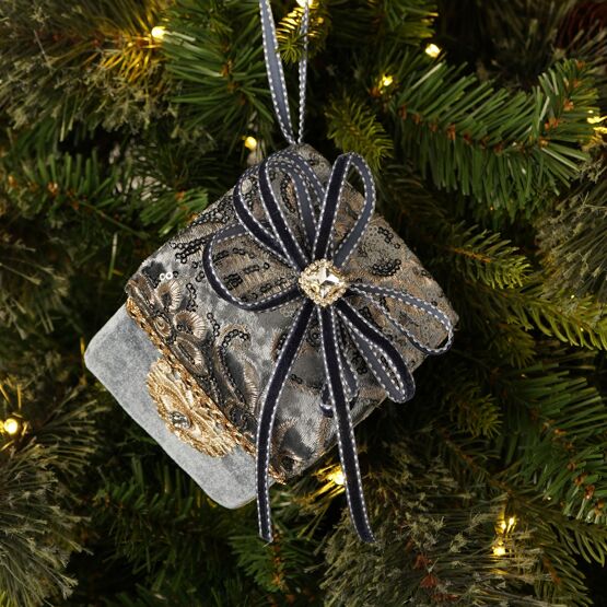 The Embroidered Gift Box Tree Decoration – Blue 15cm adds a touch of refined opulence to Christmas styling.