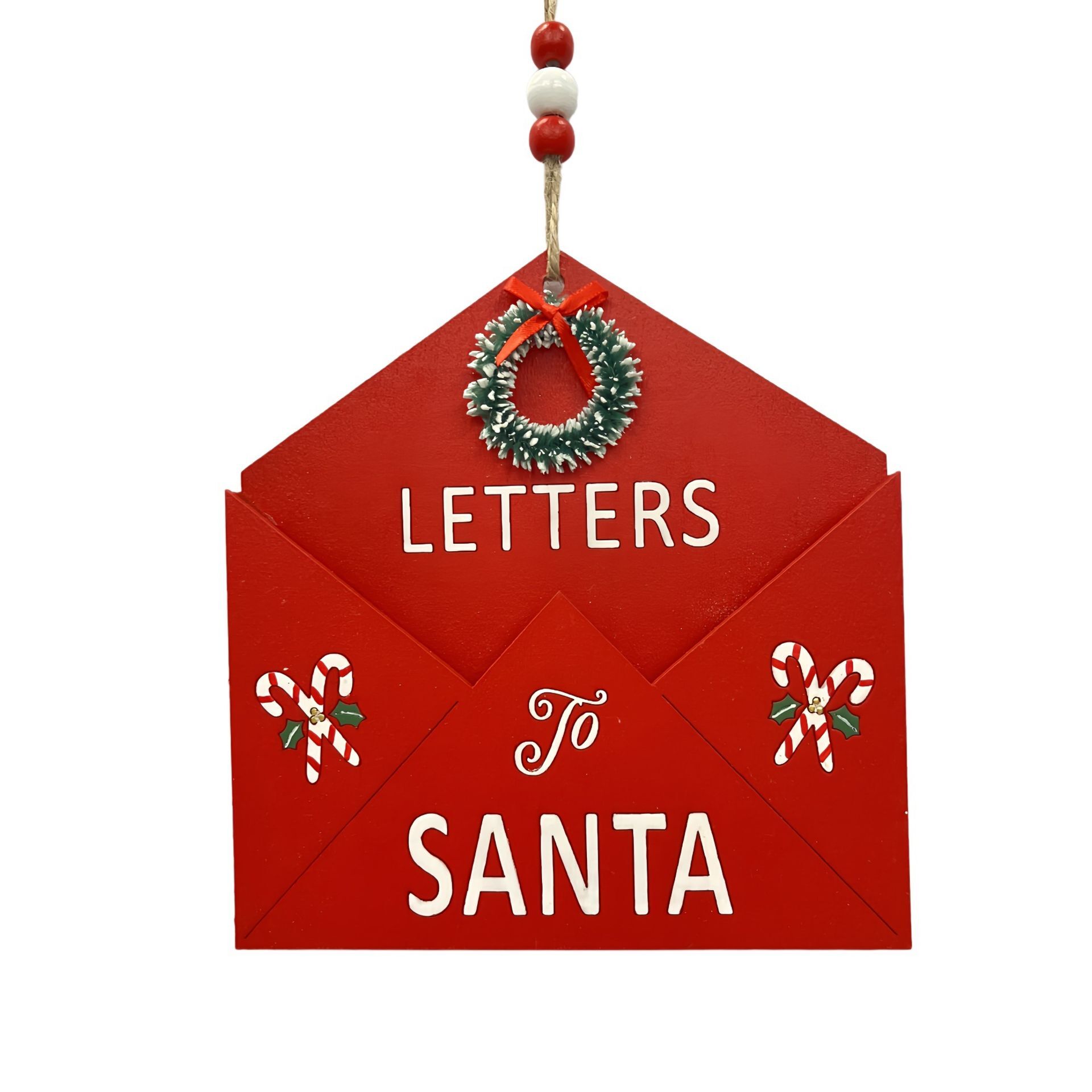 A red envelope-shaped ornament, it features bold "LETTERS TO SANTA" text and a charming wreath motif, blending festive nostalgia with a modern edge. The design is crisp and cheerful, perfect for adding a touch of whimsy to seasonal decor.