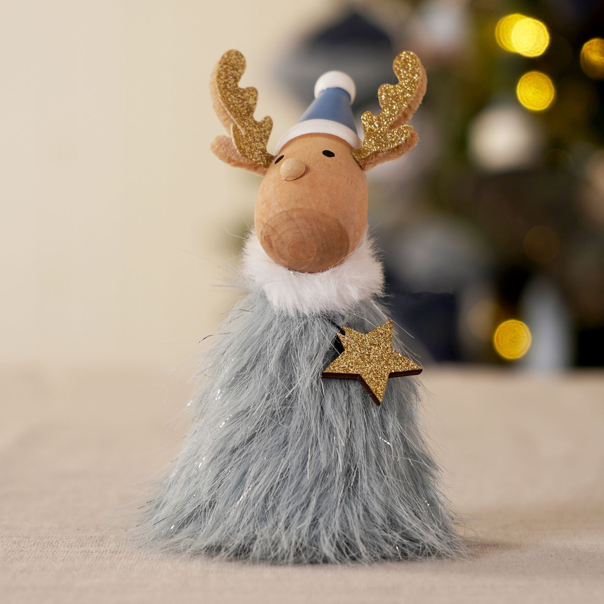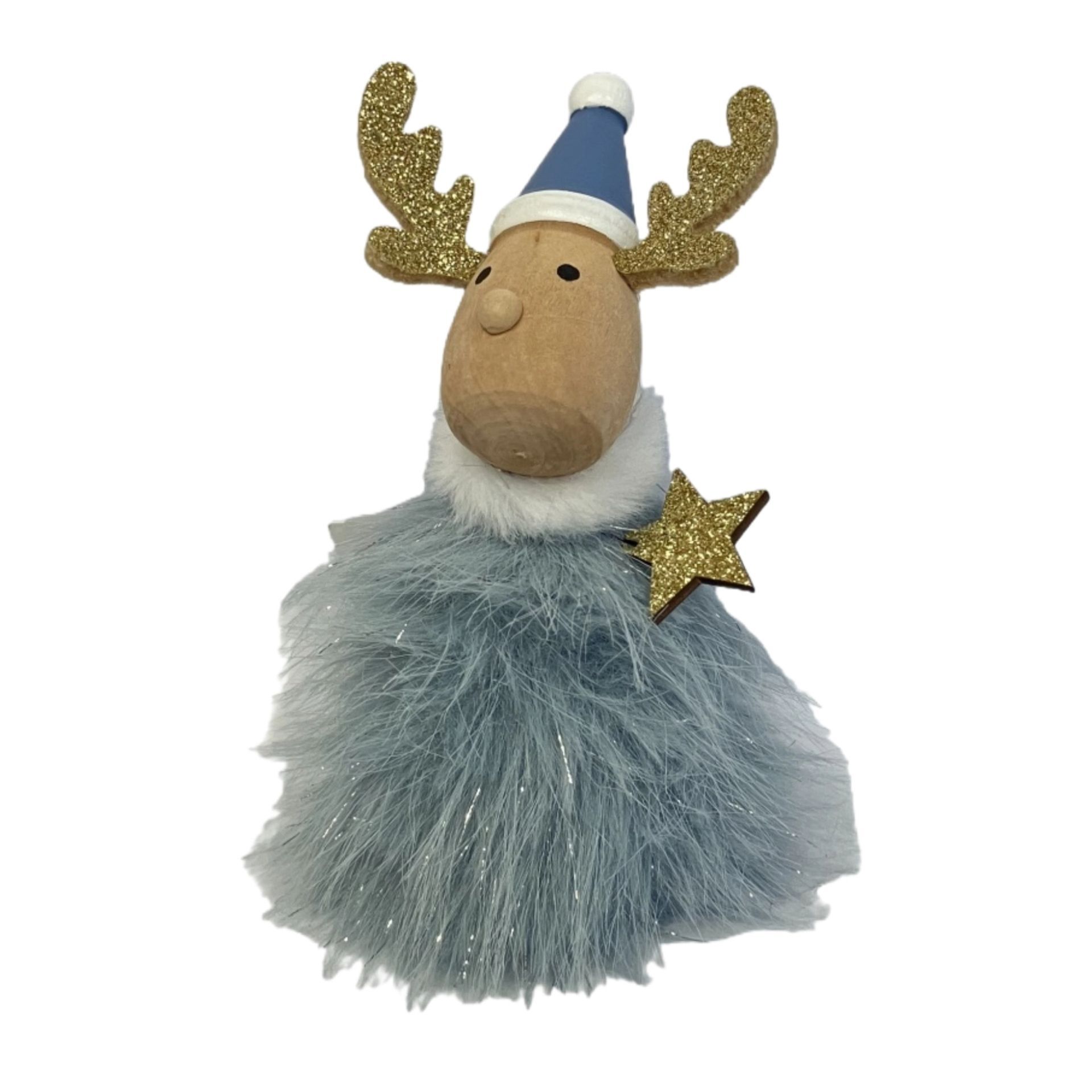This charming figure features a wooden reindeer head with golden antlers, a soft blue faux-fur body, and a glittering star detail. Stands beautifully on shelves, mantelpieces, or tabletops, complementing soft-toned seasonal styling.