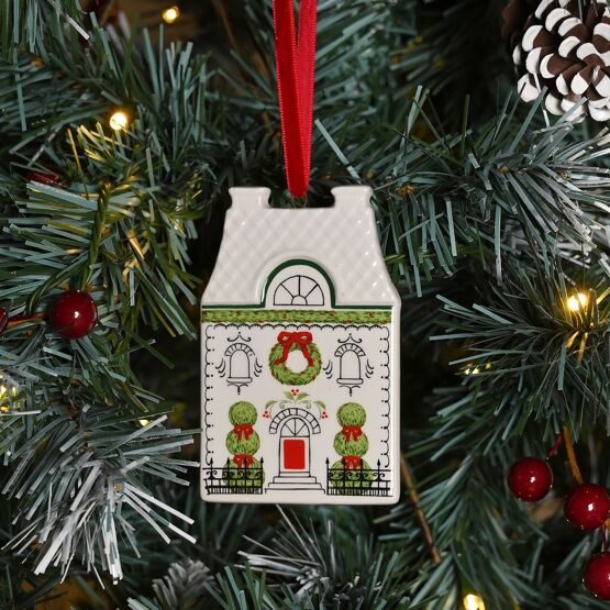 This decorative ceramic house-shaped ornament features a classic red door, festive wreath, and topiary bushes. Its compact size makes it ideal for hanging on Christmas trees, incorporating into garlands, or accenting shelf arrangements.