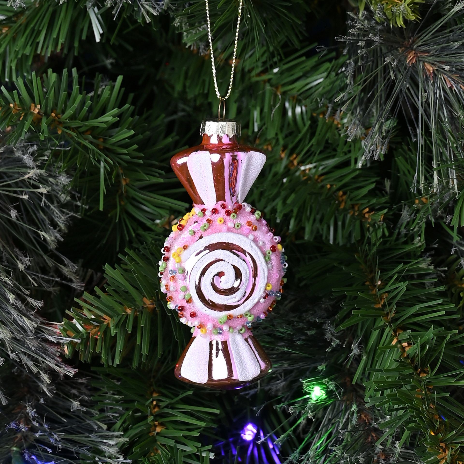 The Glass Candy Bauble is a vibrant, retro-inspired sweet-shaped decoration in glossy glass.