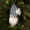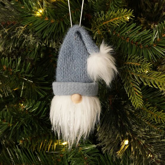 A small gonk hat rests atop a sleek white bell finished in soft blue tones. Perfect for trees or gift styling, it brings a light, modern note to festive assortments.