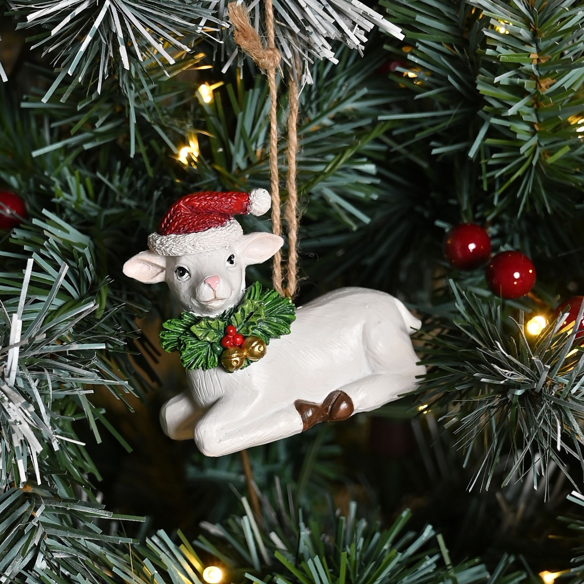 Featuring a white lamb wearing a bright red Santa hat and a green wreath around its neck, this piece combines gentle detailing with a crisp white finish that evokes rustic charm. Perfect for adding character to Christmas trees, garlands, or shelf arrangements, its classic palette and handcrafted-inspired design suit both traditional and modern retail settings.