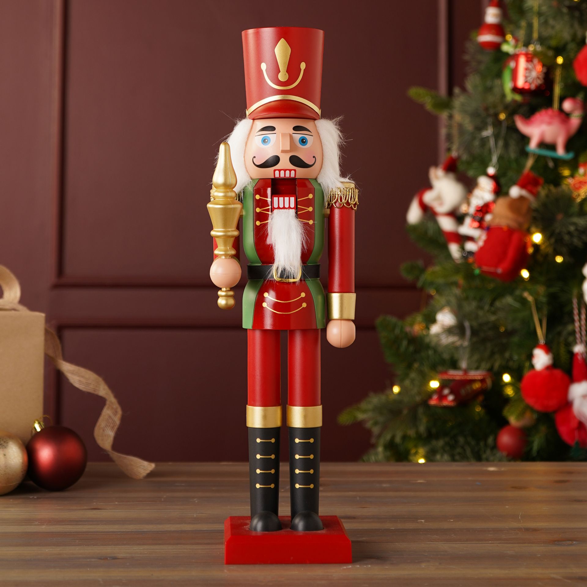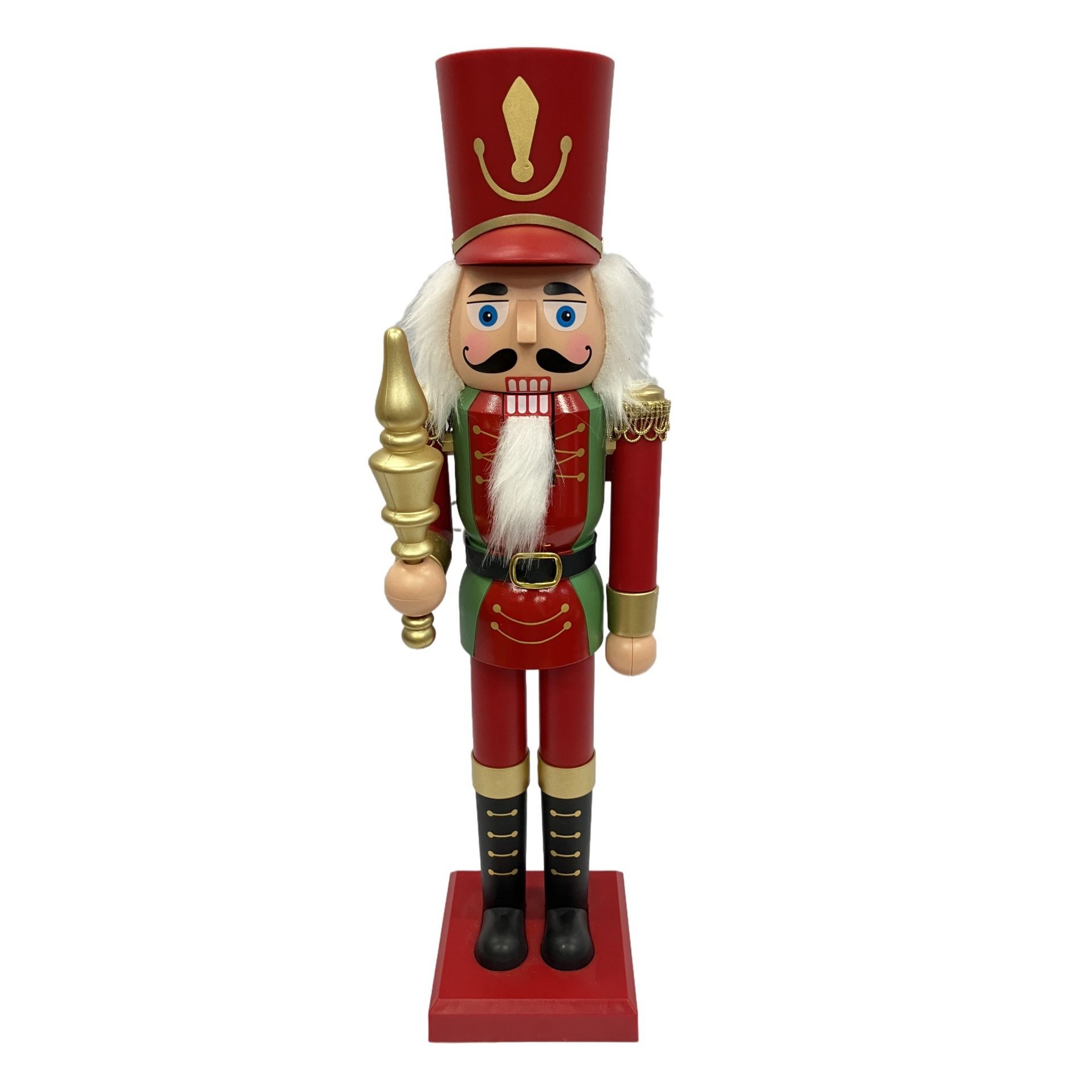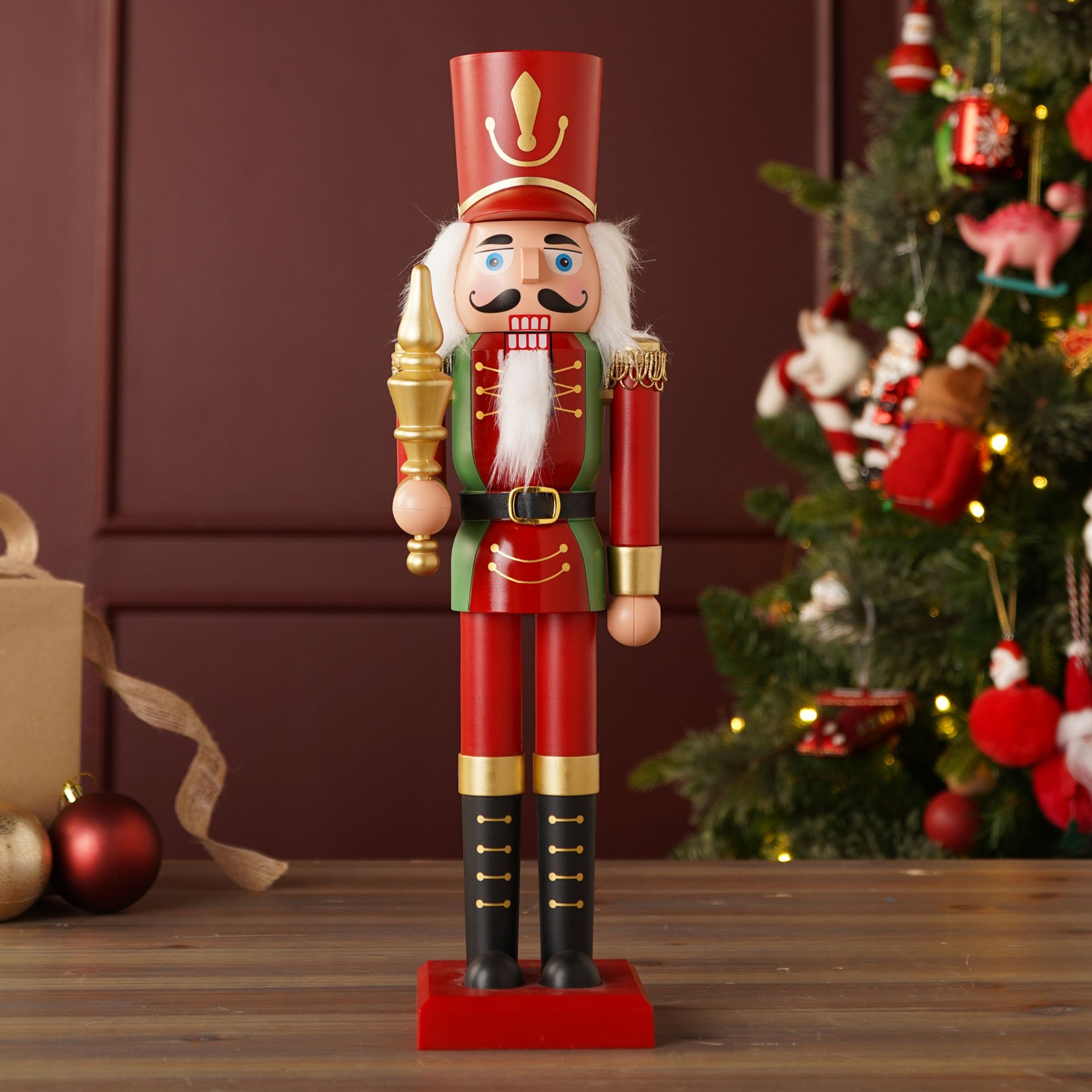 A red and green nutcracker soldier figure stands proudly on a sturdy wooden base, holding a golden scepter and wearing a tall, regal red hat. Subtle gold accents and playful painted details enhance its cheerful charm, making it a standout festive favourite.