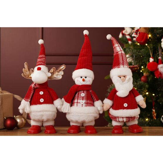 Three plush figures, dressed in classic red and white outfits, showcase the cheerful faces of Santa Claus, a snowman, and a reindeer. Soft textures and charming stitched details lend a modern twist to nostalgic characters.