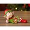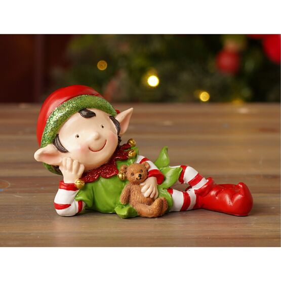 A smiling elf-like figure in a green and red outfit is lying on the ground, holding a small stuffed animal. The smooth finish and vibrant colours lend a cheerful personality, perfect for adding a touch of whimsy to seasonal displays.