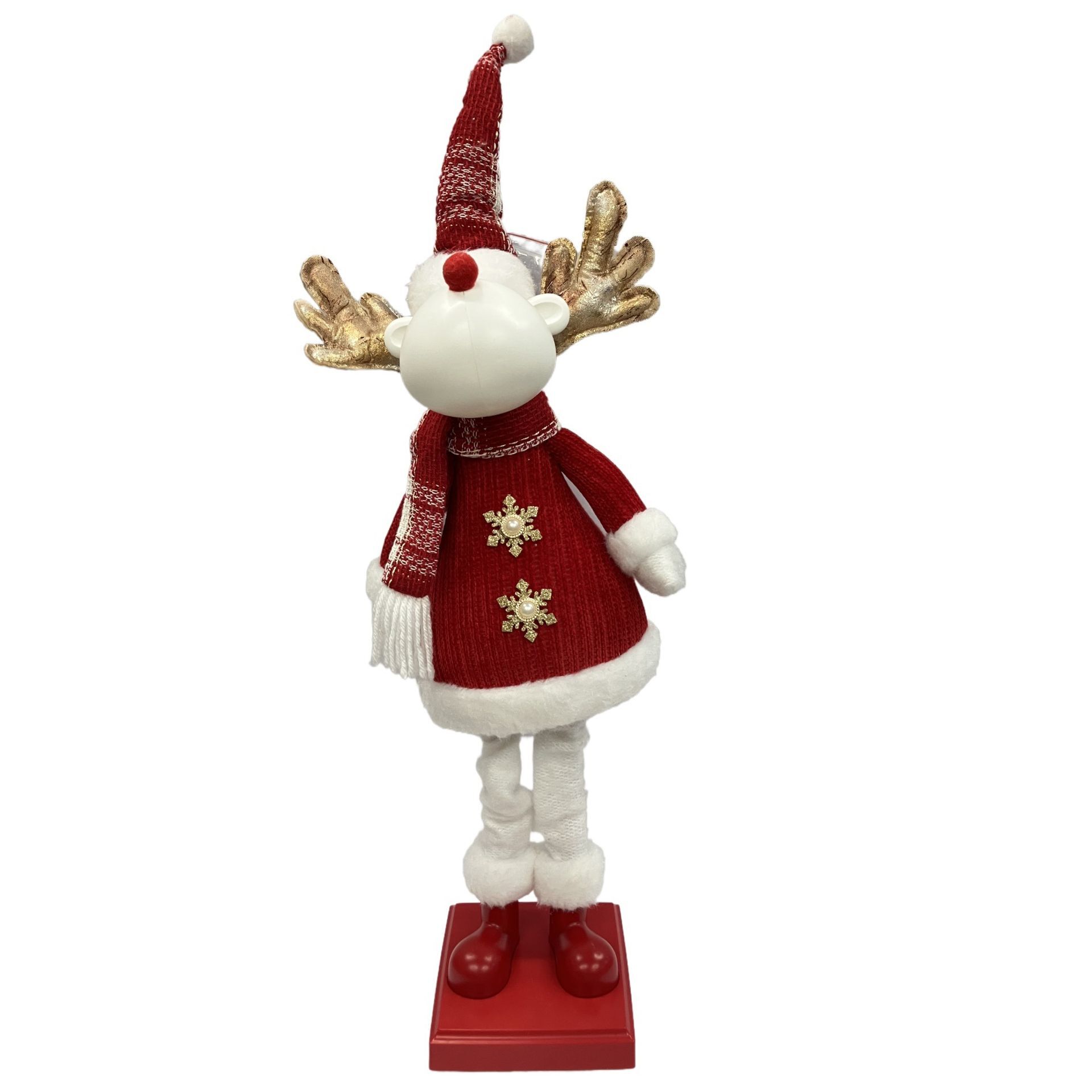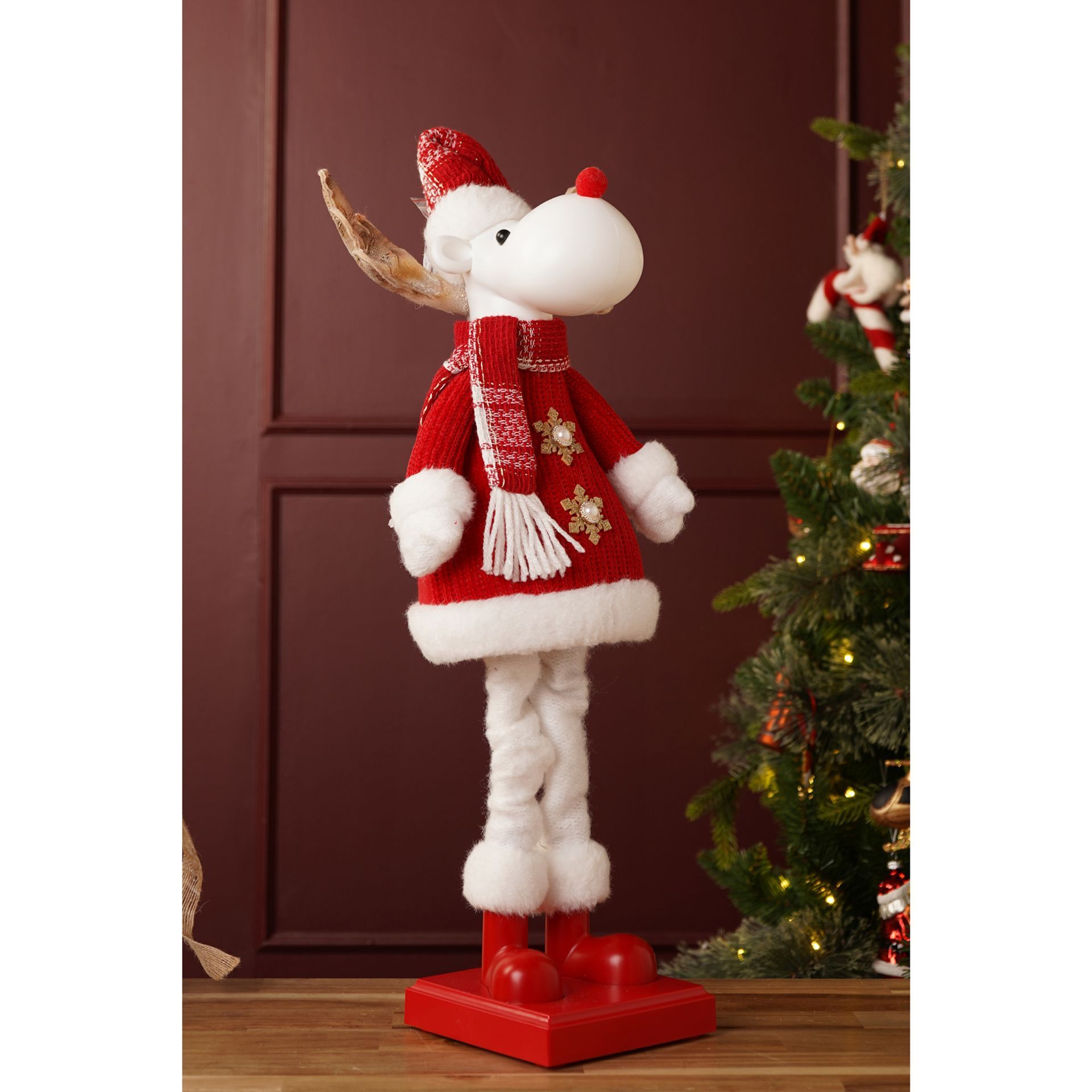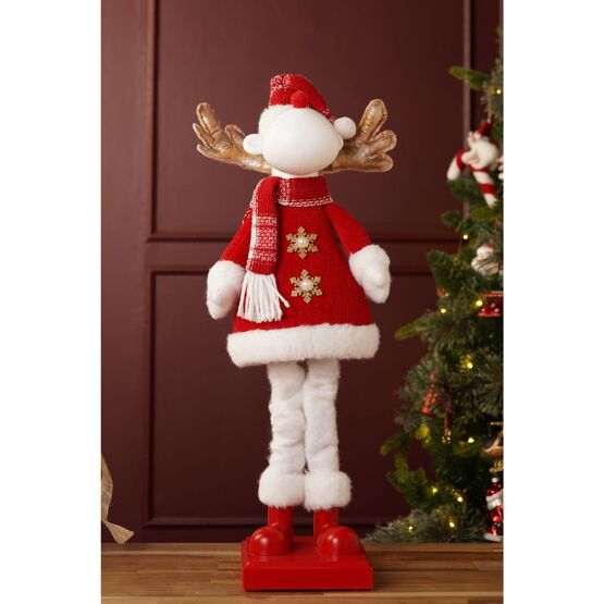 A festive plush reindeer figure wearing a red and white outfit with snowflake patterns, standing on a red base, adds a cheerful note to seasonal displays. Its soft textures and whimsical details capture the spirit of the holidays with a modern edge.