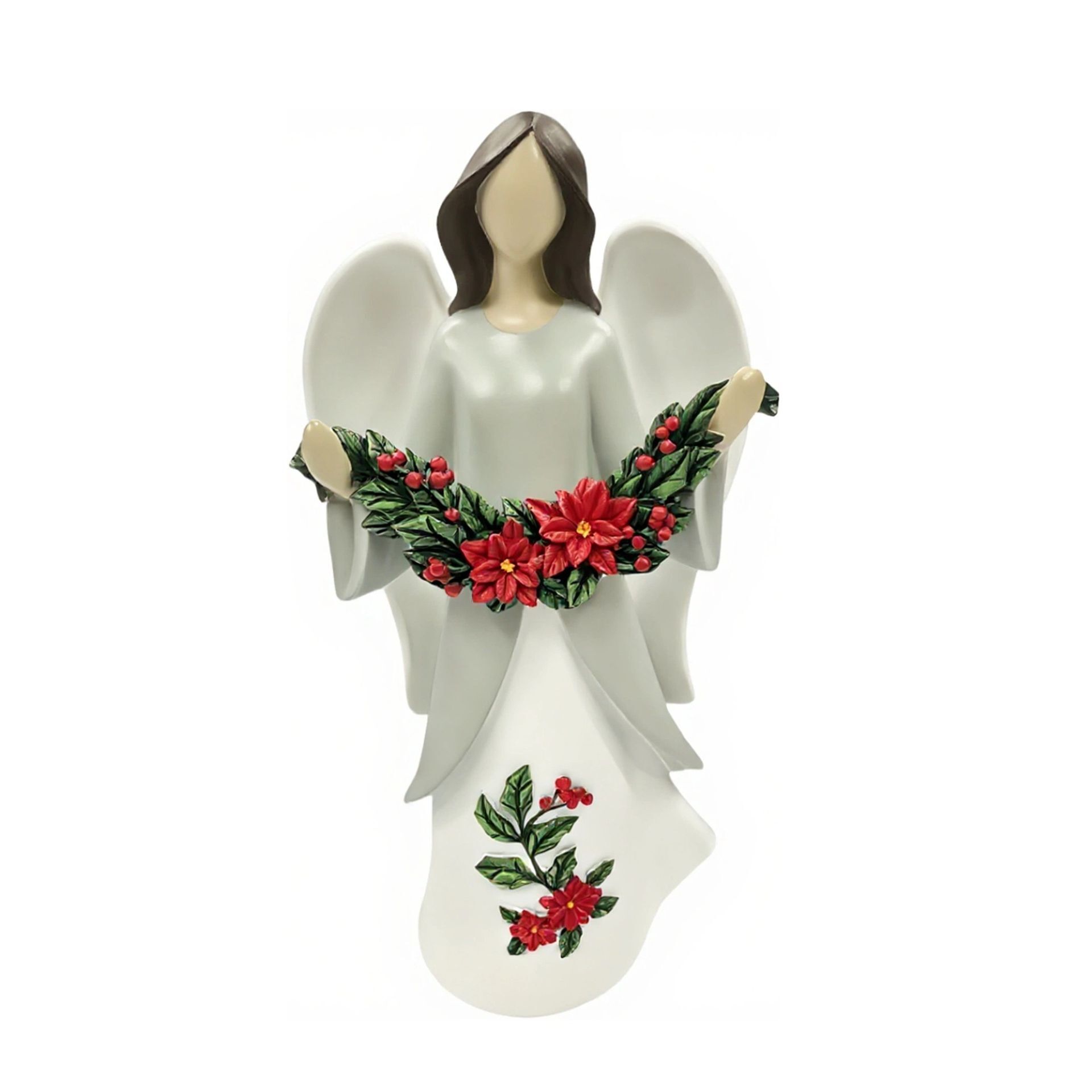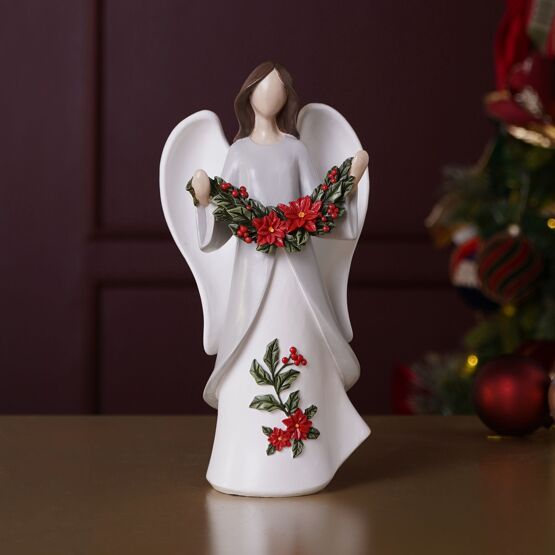The Regal Tidings Angel with Garland Ornament brings a refined festive accent to seasonal decor, blending timeless elegance with a modern flair. This ceramic angel figurine features a white robe and wings, gracefully holding a wreath of vibrant red poinsettia flowers around its body. The smooth finish and intricate detailing evoke classic Christmas charm. Complete the look with more sophisticated designs from the Regal Tidings collection to elevate your seasonal display.